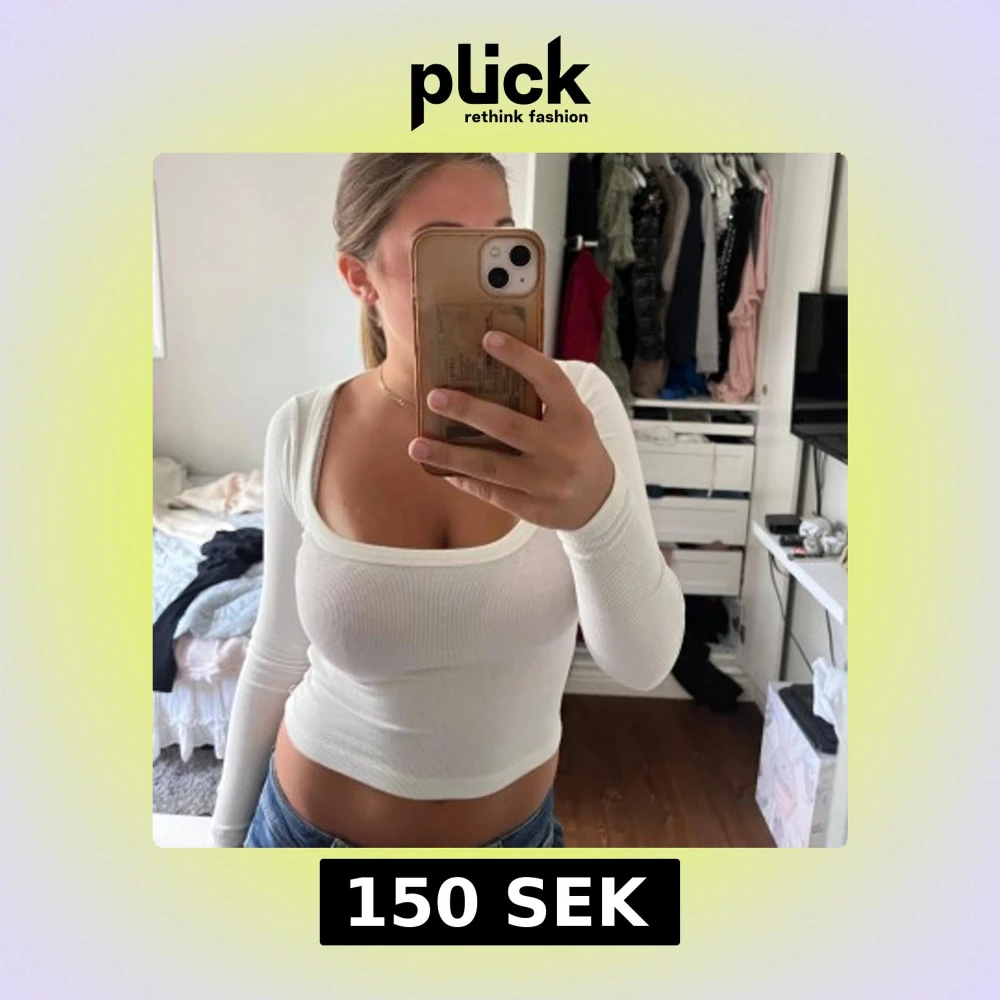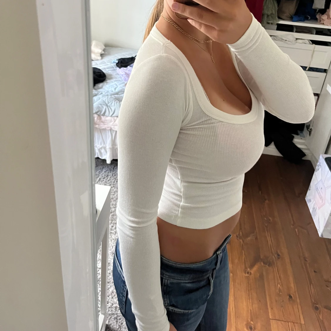 Säljer en vit croppad långärmad topp med fyrkantig ringning. Tröjan är ribbad och har en tight passform som framhäver figuren. Perfekt att styla med jeans eller kjol för en clean och fräsch look.