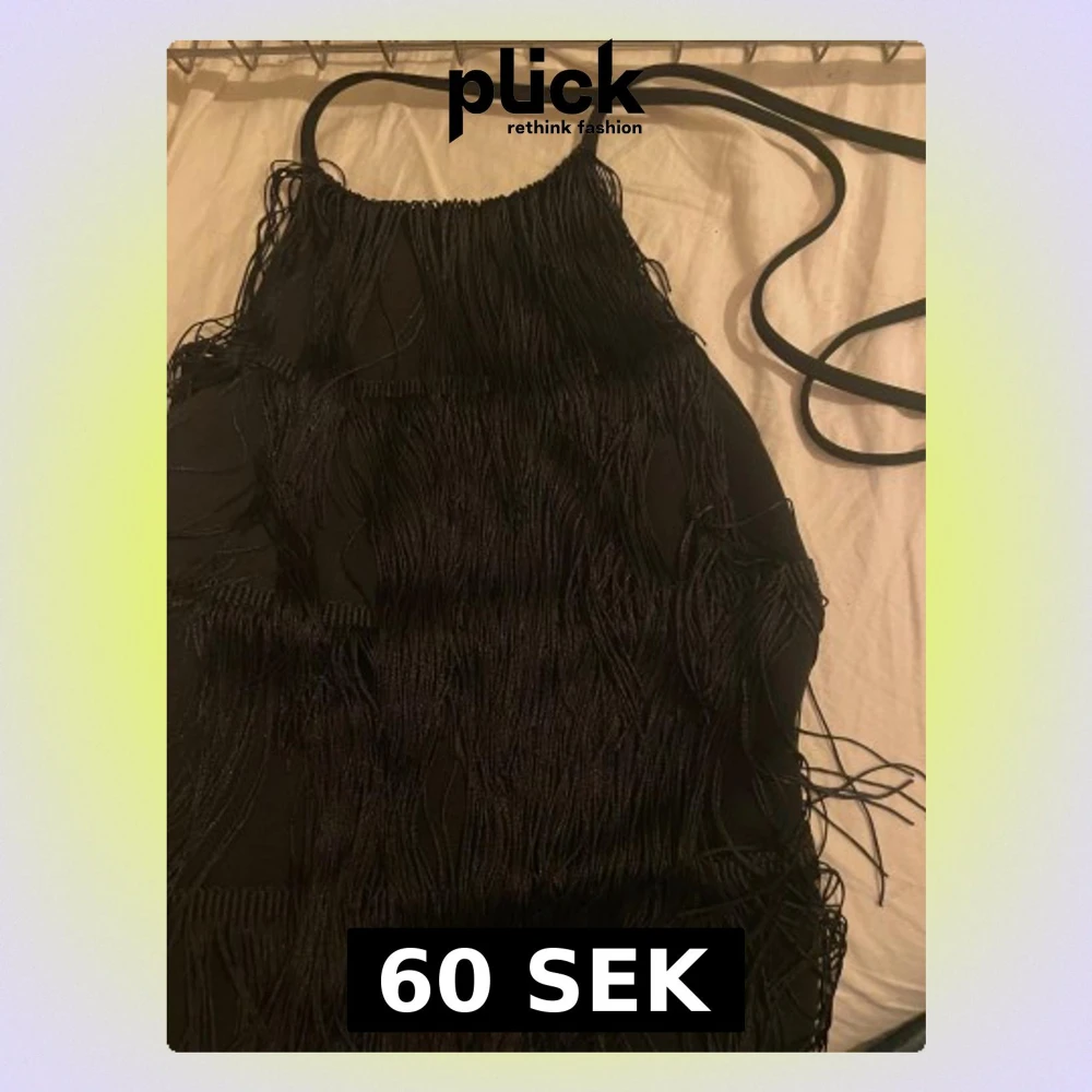 Säljer en svart linnetopp med öppen rygg. Toppen har långa fransar framtill som ger en cool och unik look. Materialet känns mjukt och lätt, perfekt för att sticka ut. Passformen är tight och toppen är ärmlös.