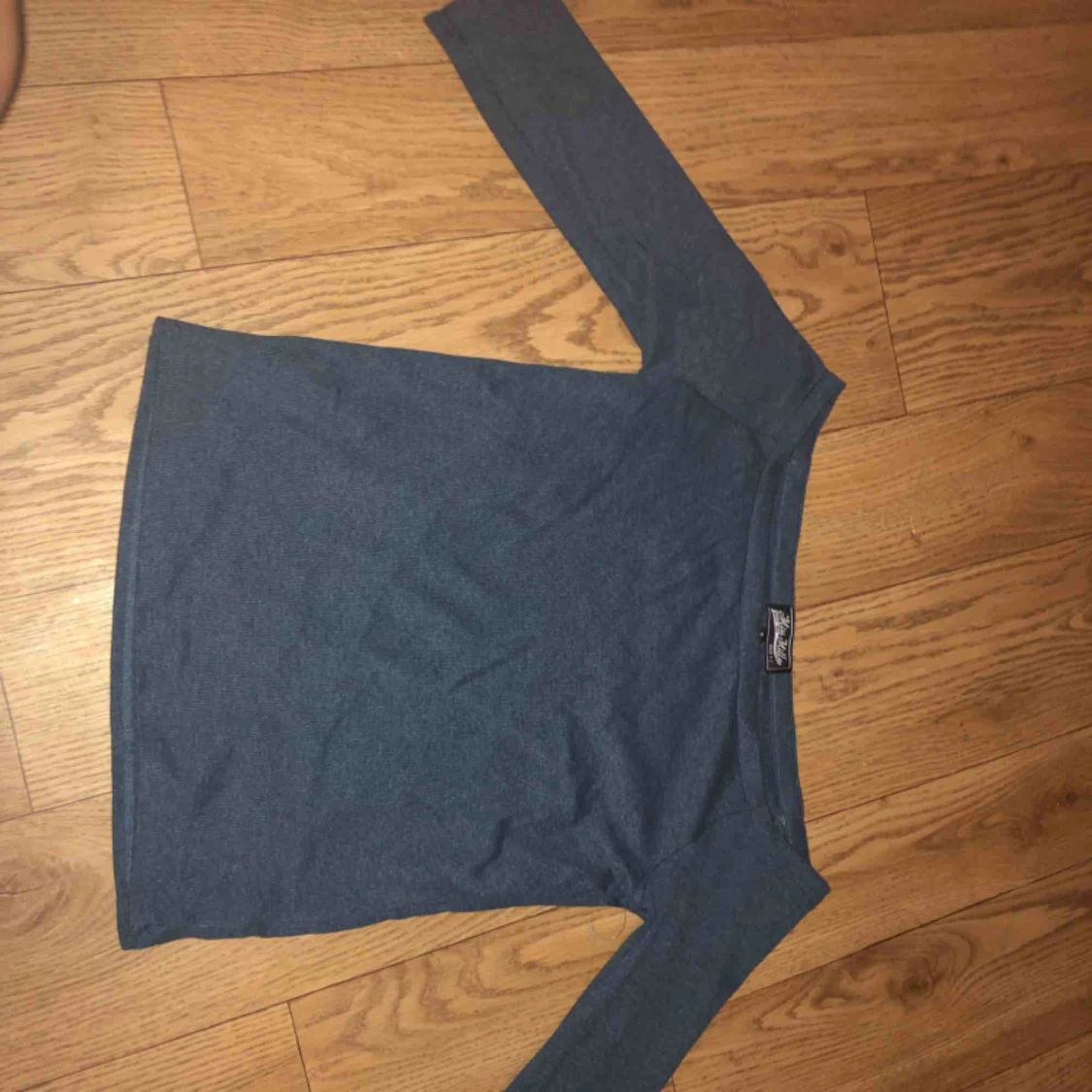 En fin marinblå off shoulder tröja som är ungefär vid armvecken längd på armarna