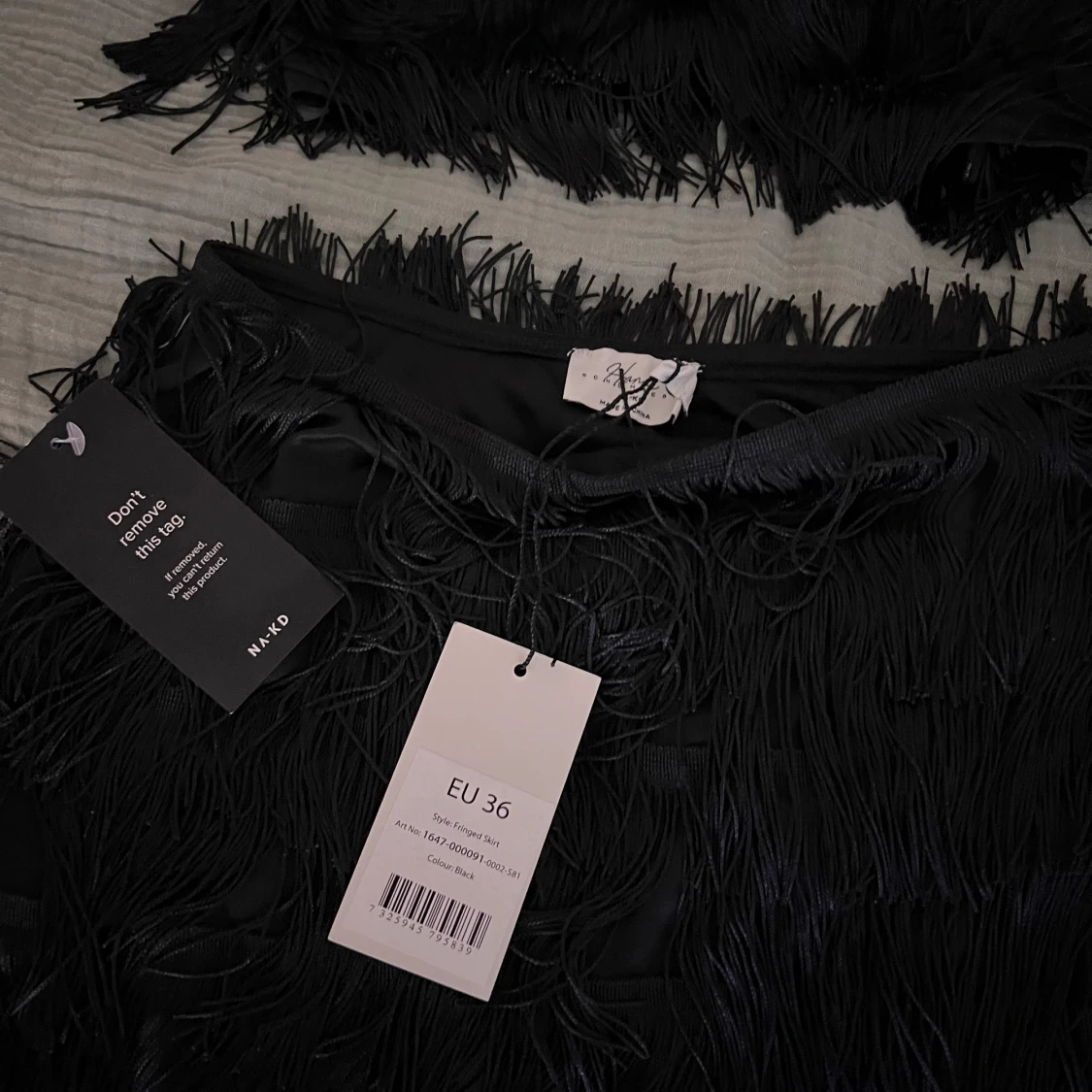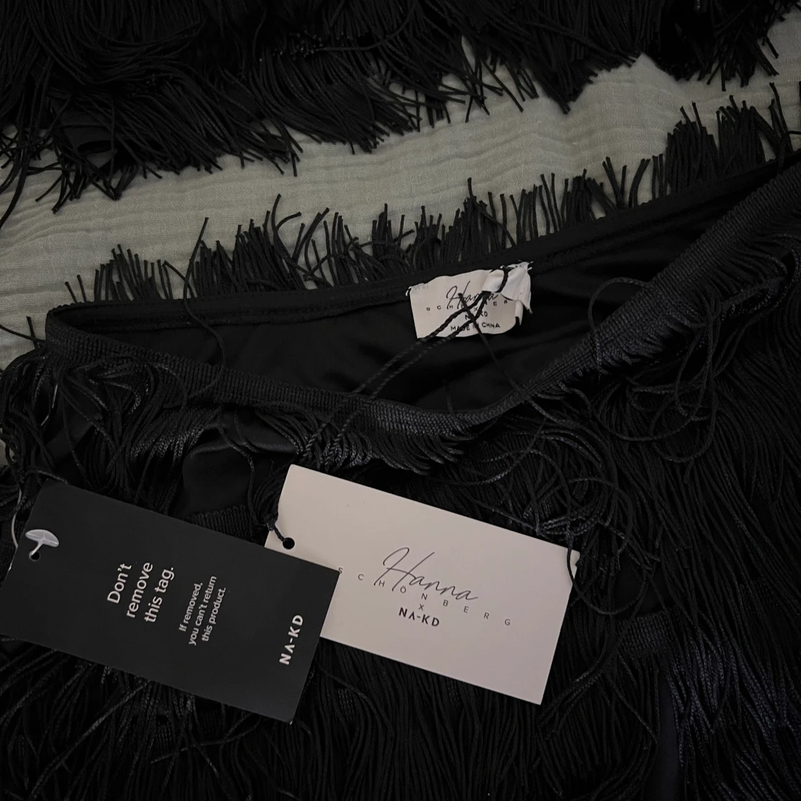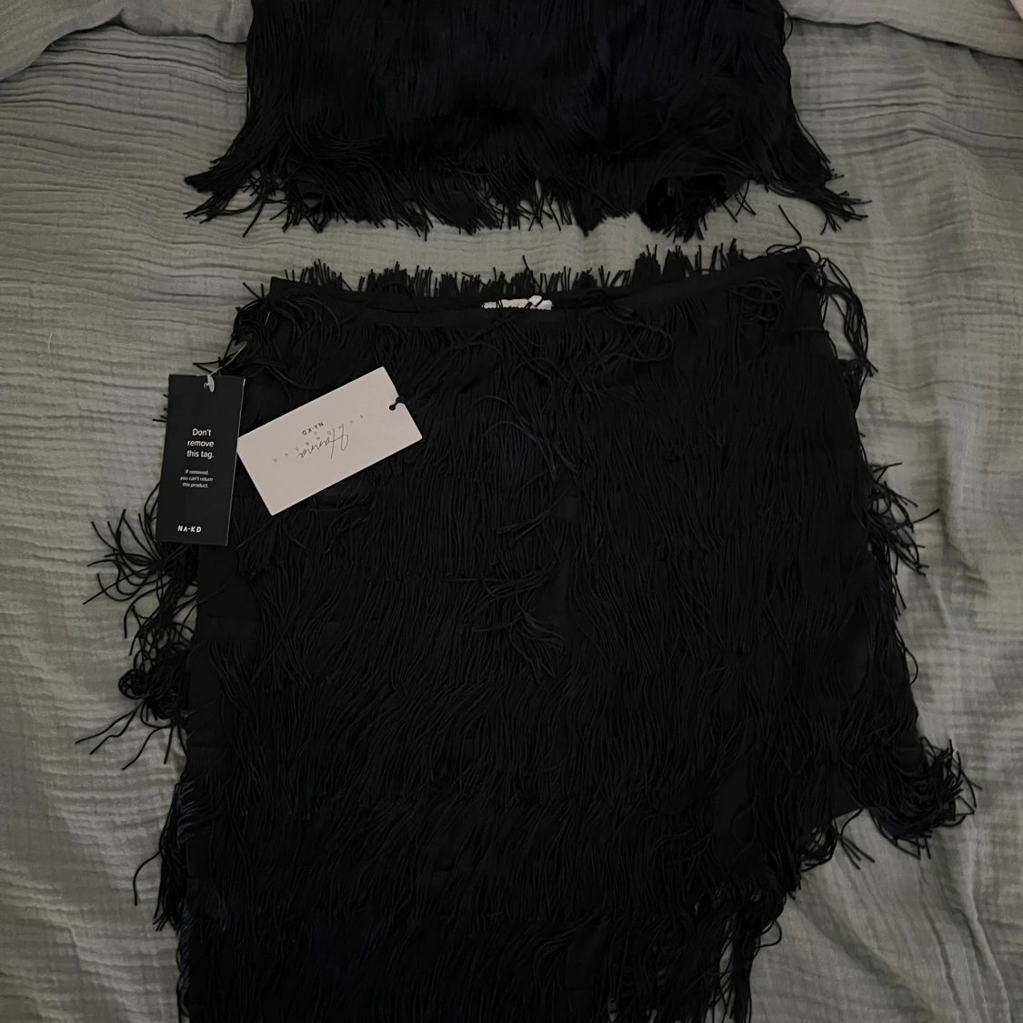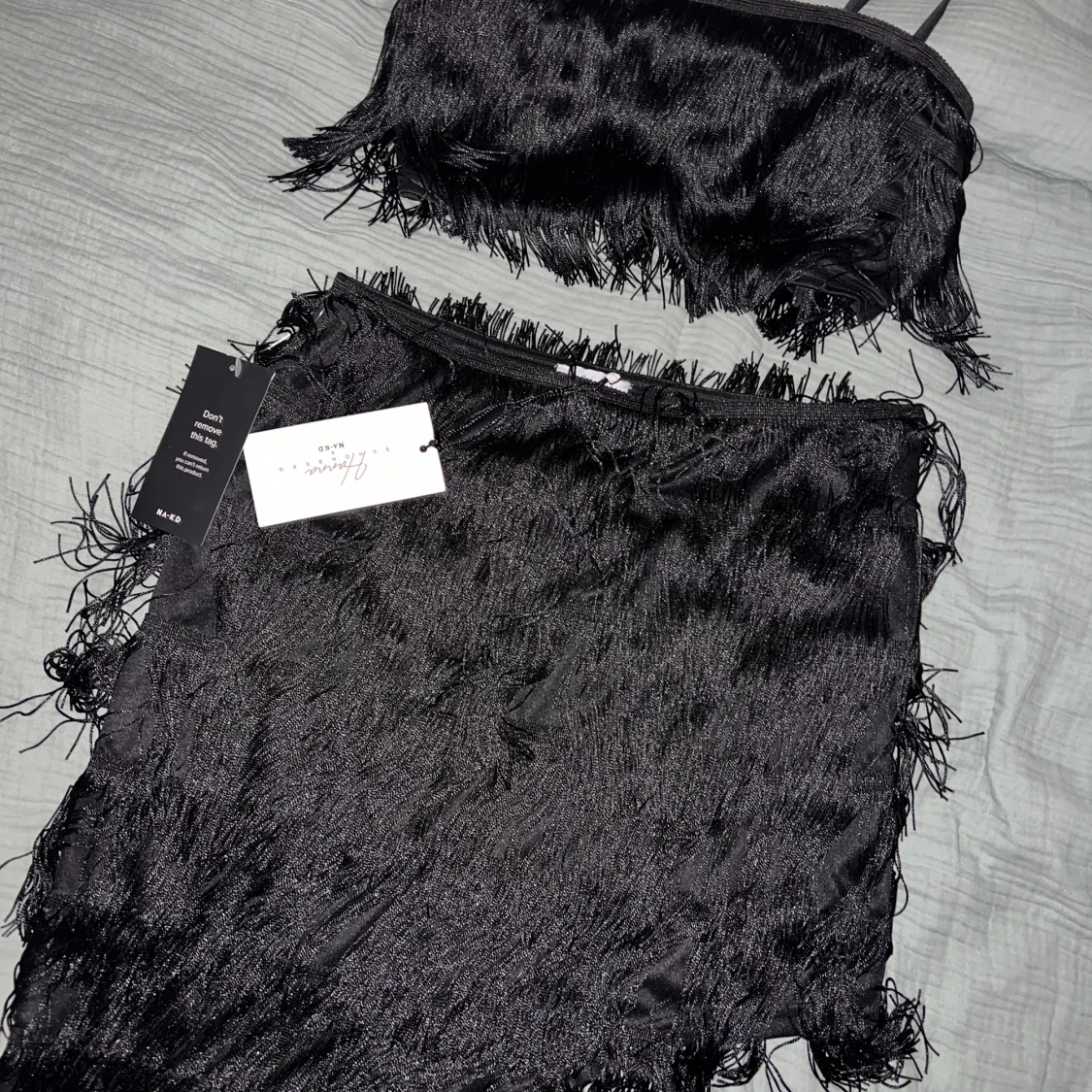 Fint set med fransar från NA-KDxHanna Schönberg. Kjolen är oanvänd och toppen är använd 1 gång. Dragkedja i sida på både topp och kjol.