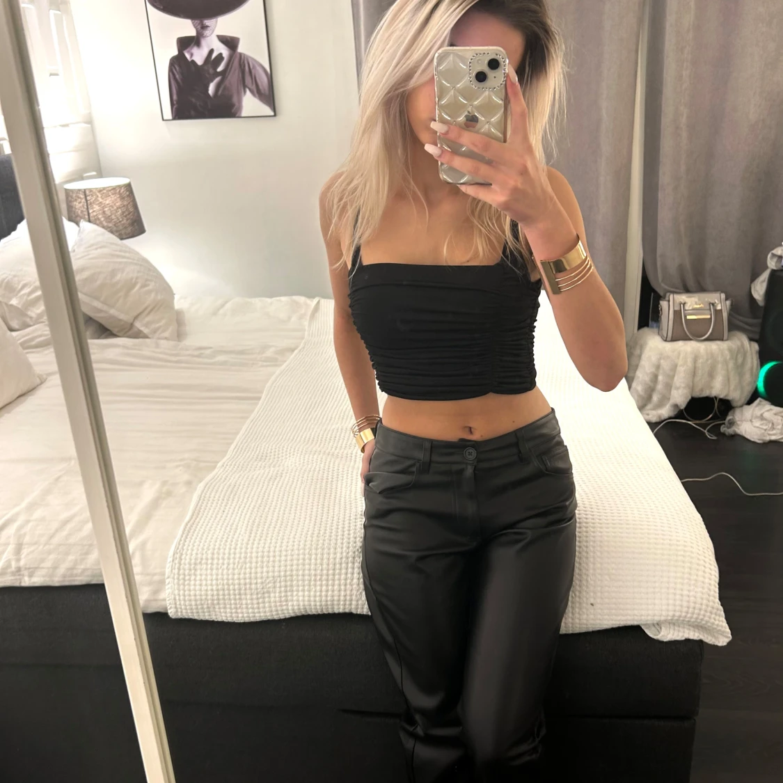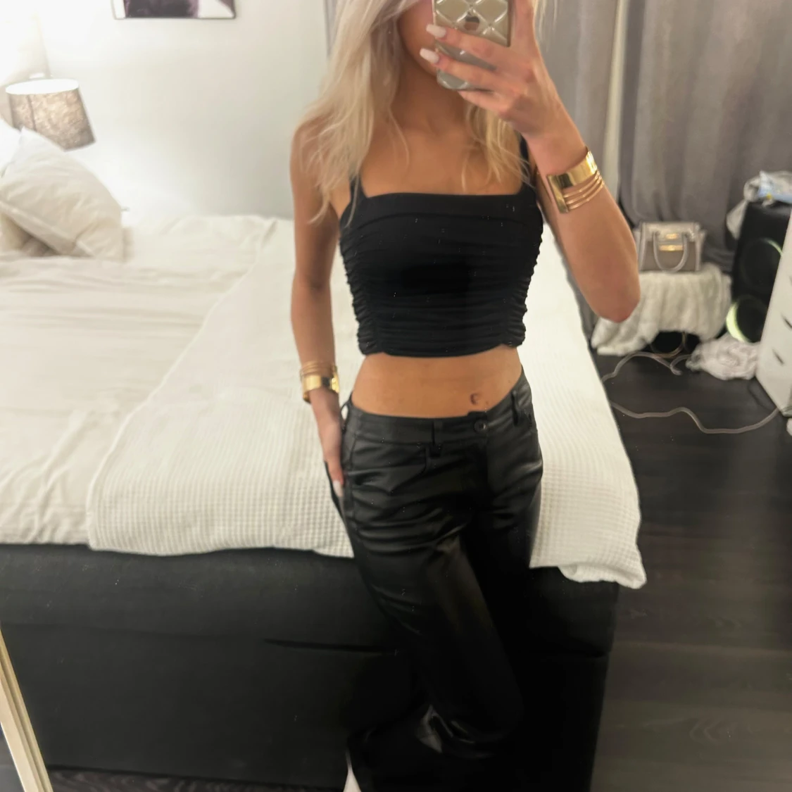 Säljer ett par svarta skit snygga utsvänga läder byxor . Byxan har en tight passform, perfekt för en trendig look.