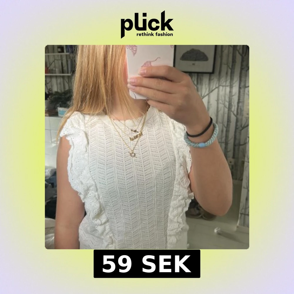 Säljer en söt vit blus med breda volangdetaljer längs axlarna och sidorna. Toppen har ett stickat mönster och är ärmlös med rund hals. Perfekt att styla med jeans eller kjol för en fräsch look. Materialet känns som bomull och spets.