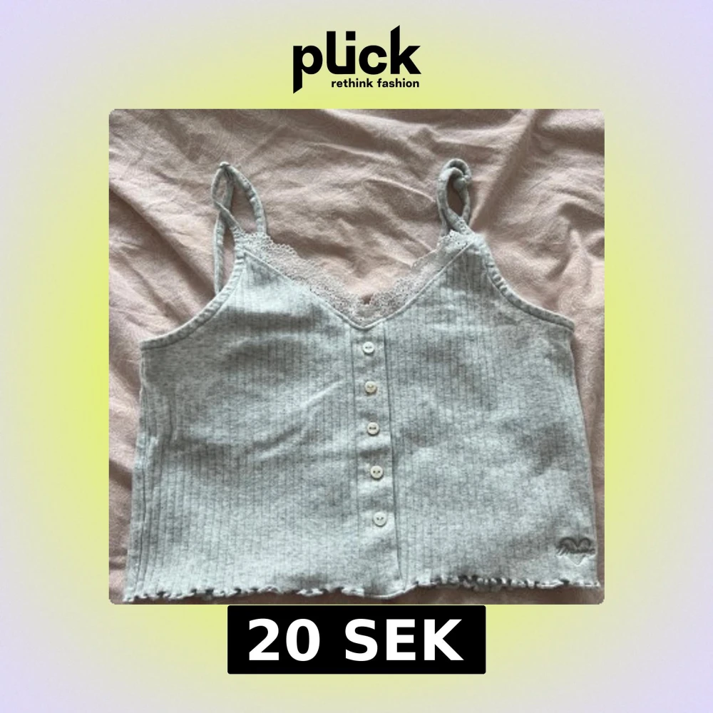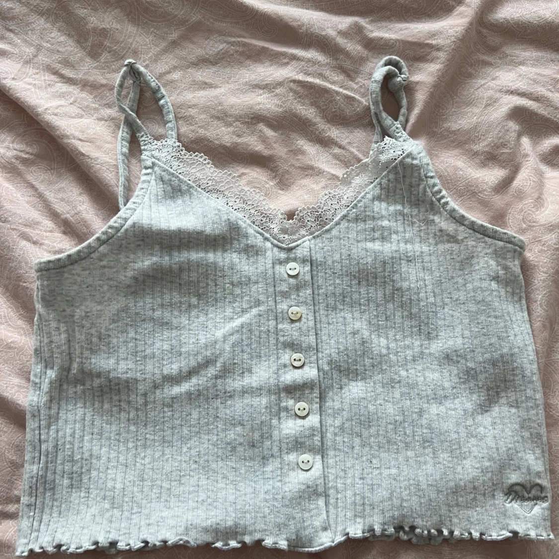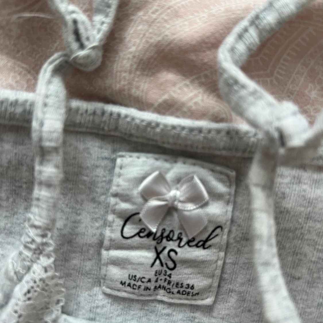 Supersöt ljusgrå ribbad linnetopp från Censored med spetskant vid v-ringningen, knappar framtill och små volangdetaljer längst ner. Axelbanden är smala och toppen har en liten rosett vid etiketten. Perfekt för en chill och söt look.