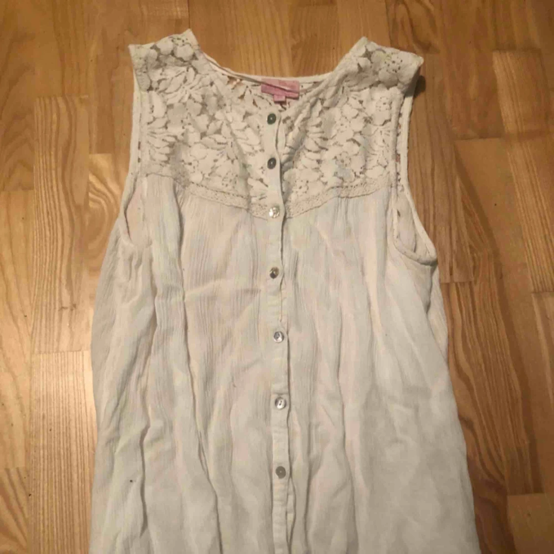 Säljer en fin vitt somrig topp. Den är ett linne och har spets upptill. Den är i storlek 158/164 men passar också XS