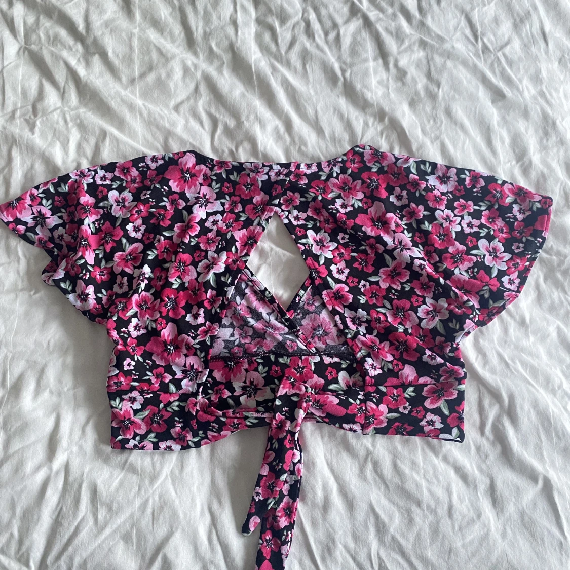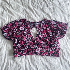 en mycket croppad topp med rosa blommor på. toppen är öppen på ryggen och kan knytas med snöre. jättefin topp man kan ha på sig på sommaren. köparen står för frakt. 💗