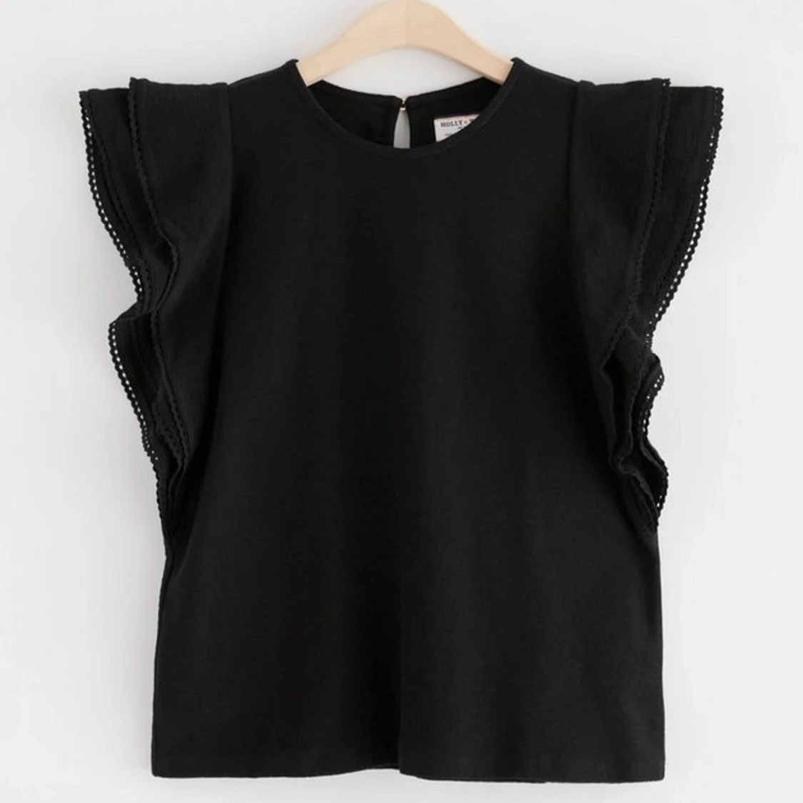 En svart topp med volanger på ärmarna, tyget är inte tunt. Säljer då den var lite stor i storleken