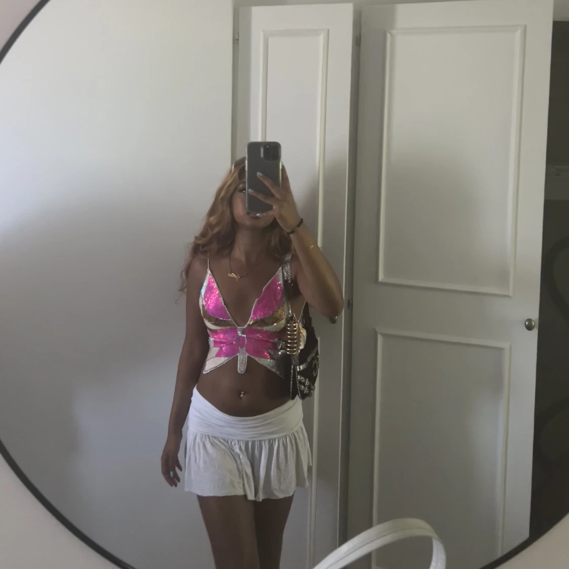 Supersöt rosa butterfly topp perfekt för sommaren man knyter ryggen så den passar storlekar mellan xs-m Använd gärna köp nu <33