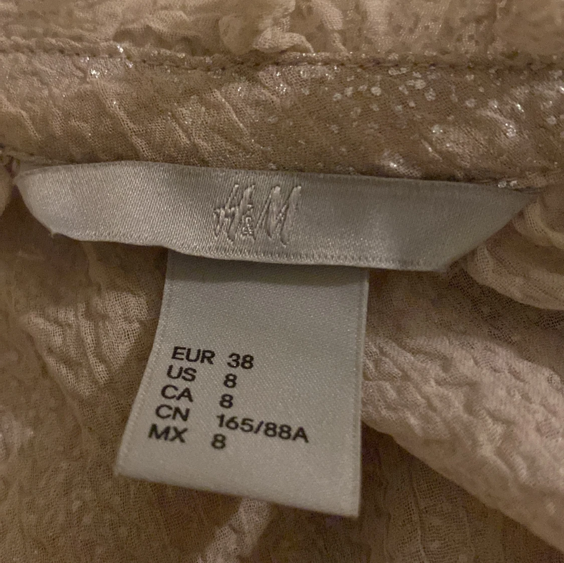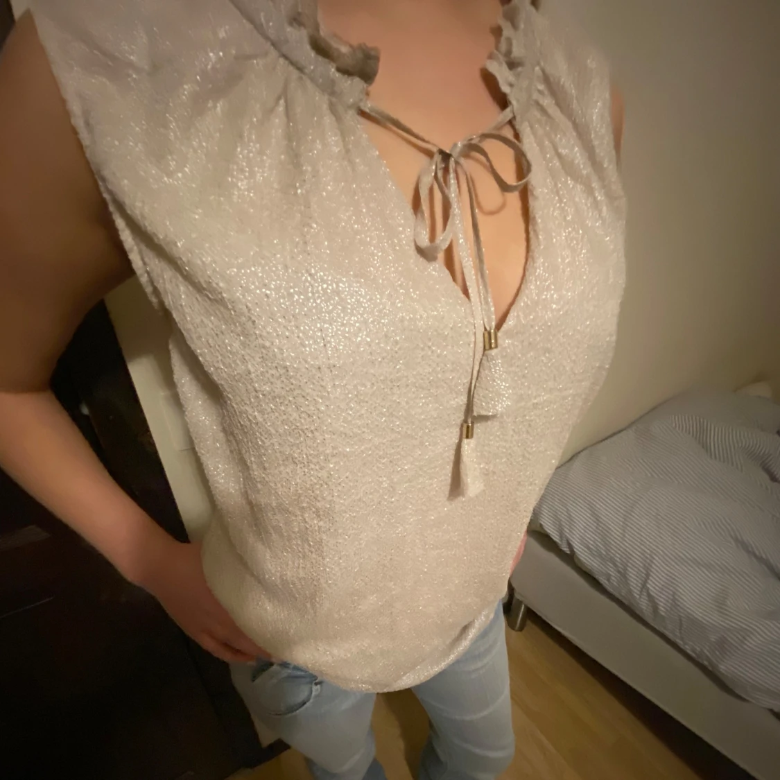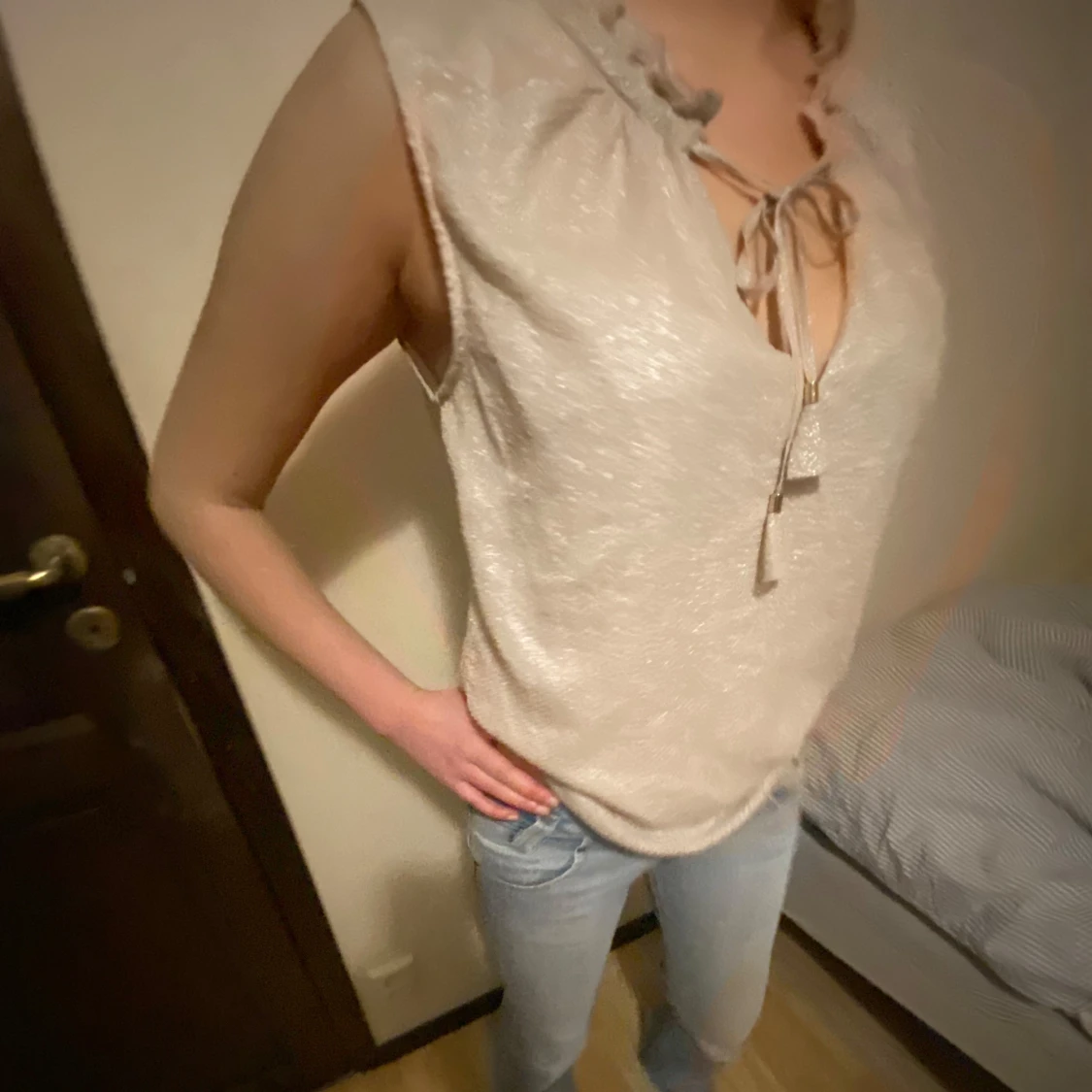 Säljer en elegant beige blus från H&M med glittrande detaljer. Blusen har en v-ringning med knytband och volangdetaljer vid halsen. Den är ärmlös och passar perfekt för en stilren look.