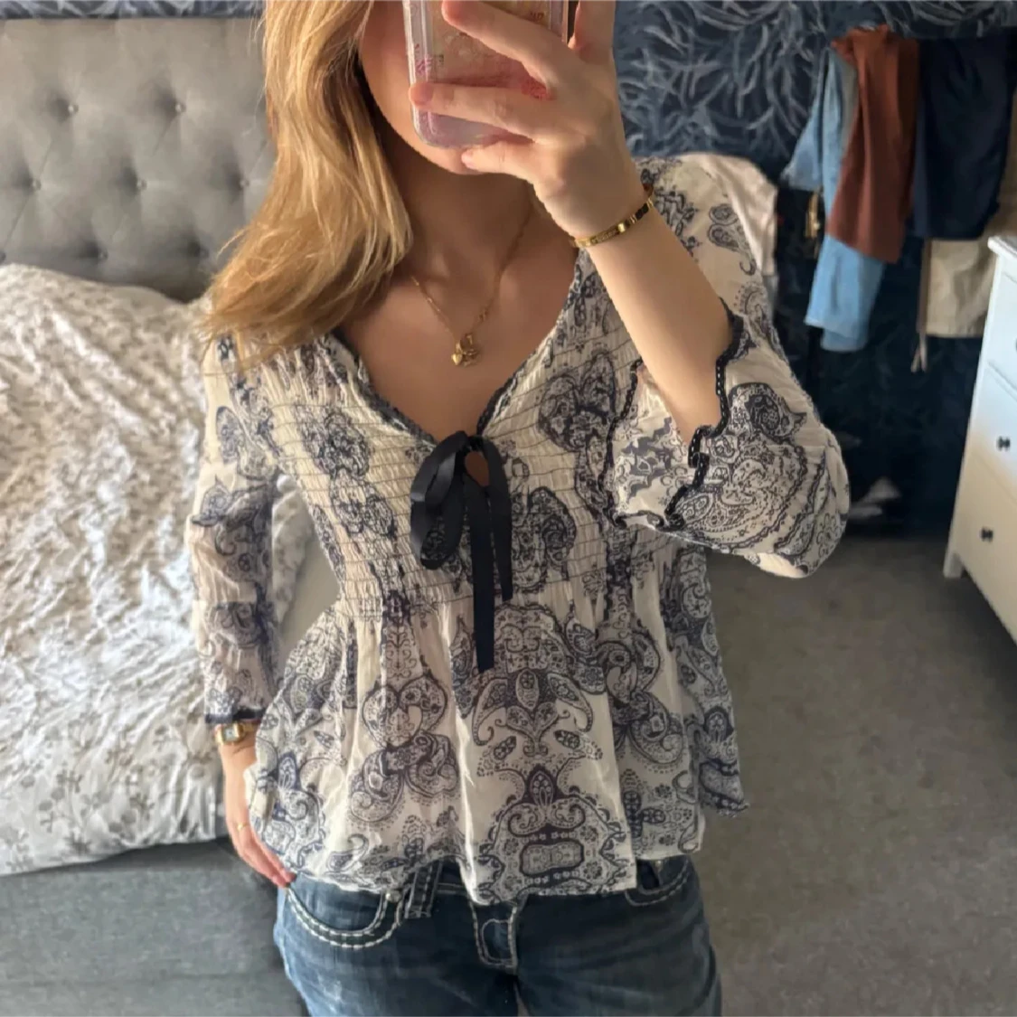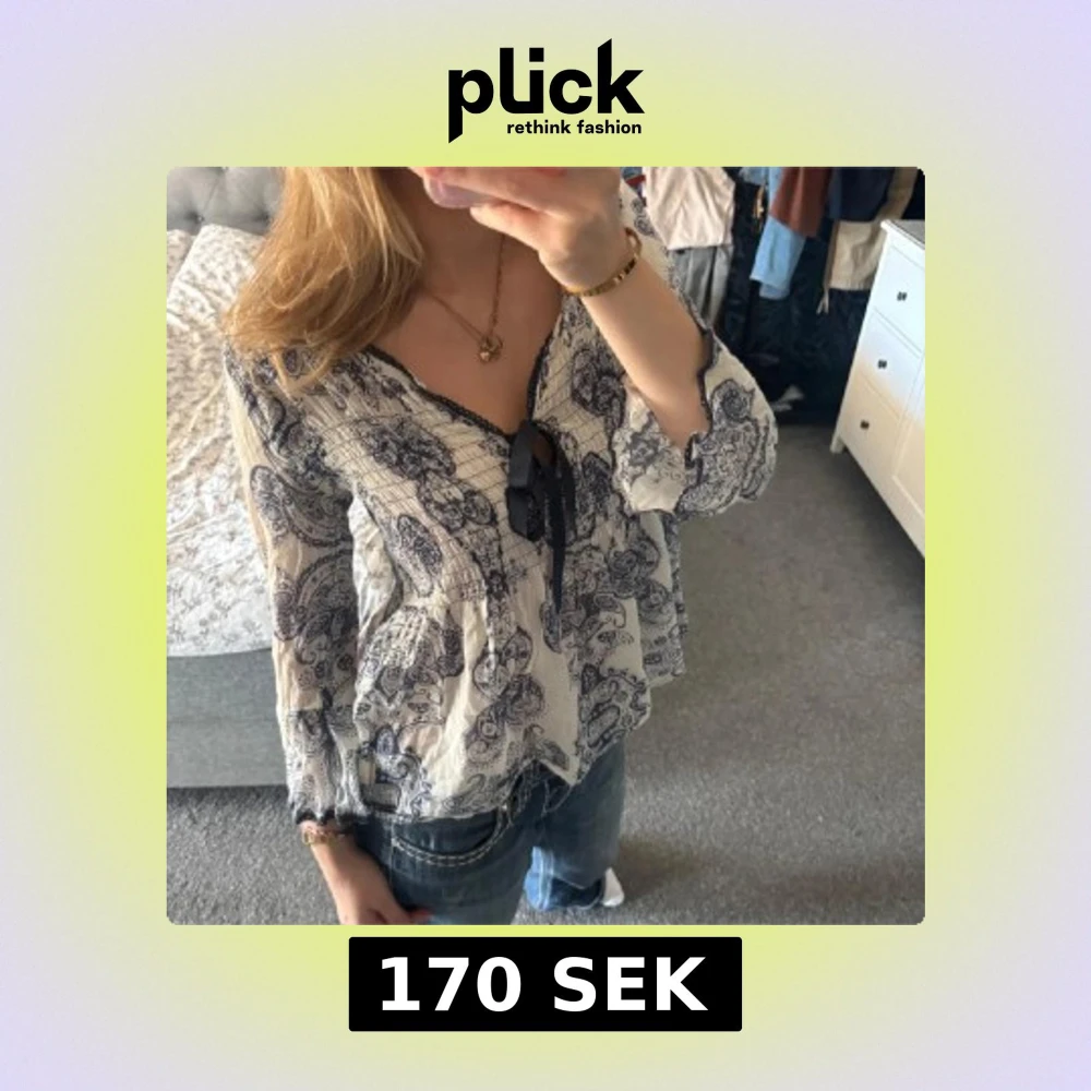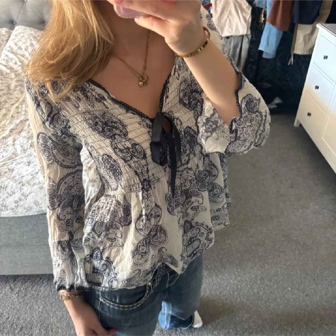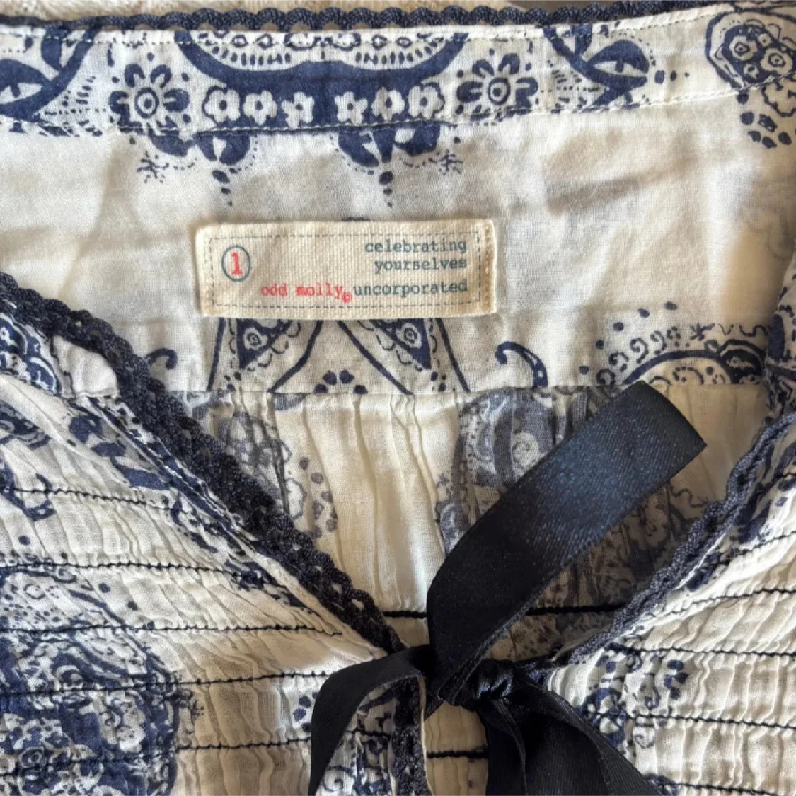 Supersöt blus från Odd Molly i vitt med marinblått paisleymönster. Blusen har v-ringning med svart knytband, smockad överdel och volangig nederdel. Trekvartsärmar med spetskant ger en romantisk vibe. Perfekt till jeans för en chill men snygg look. Den är så fin verkligen men kommer inte till användning tyvärr så hoppas den kan vara det hos någon annan. Storlek är 1 men skulle säga mellan S och M.