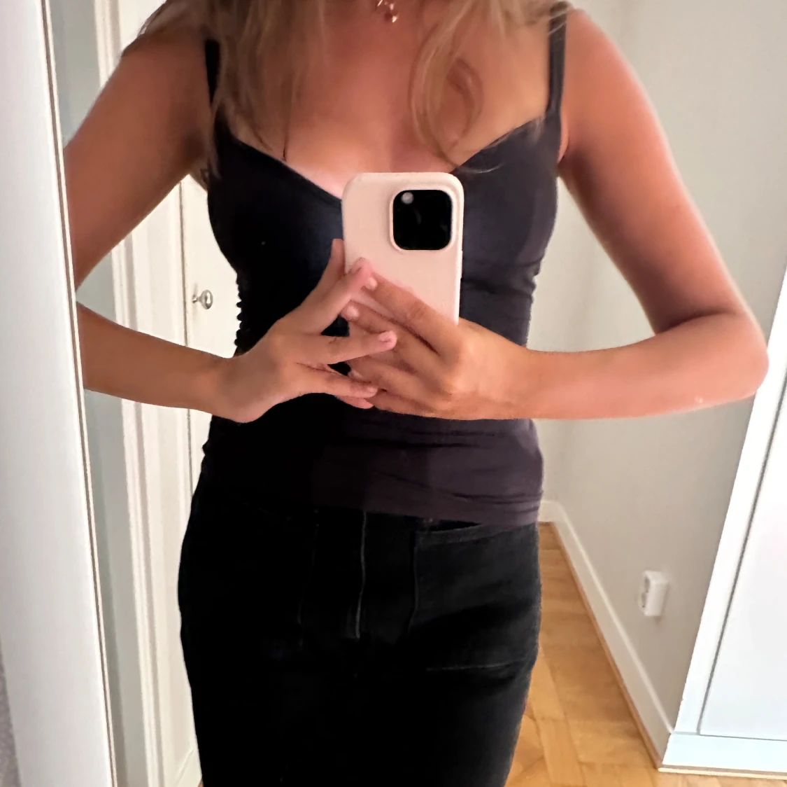 Säljer ett svart, tight linne med smala axelband och djup v-ringning. Sitter snyggt och framhäver figuren, perfekt till jeans eller kjol. Använd en gång, inga defekter!