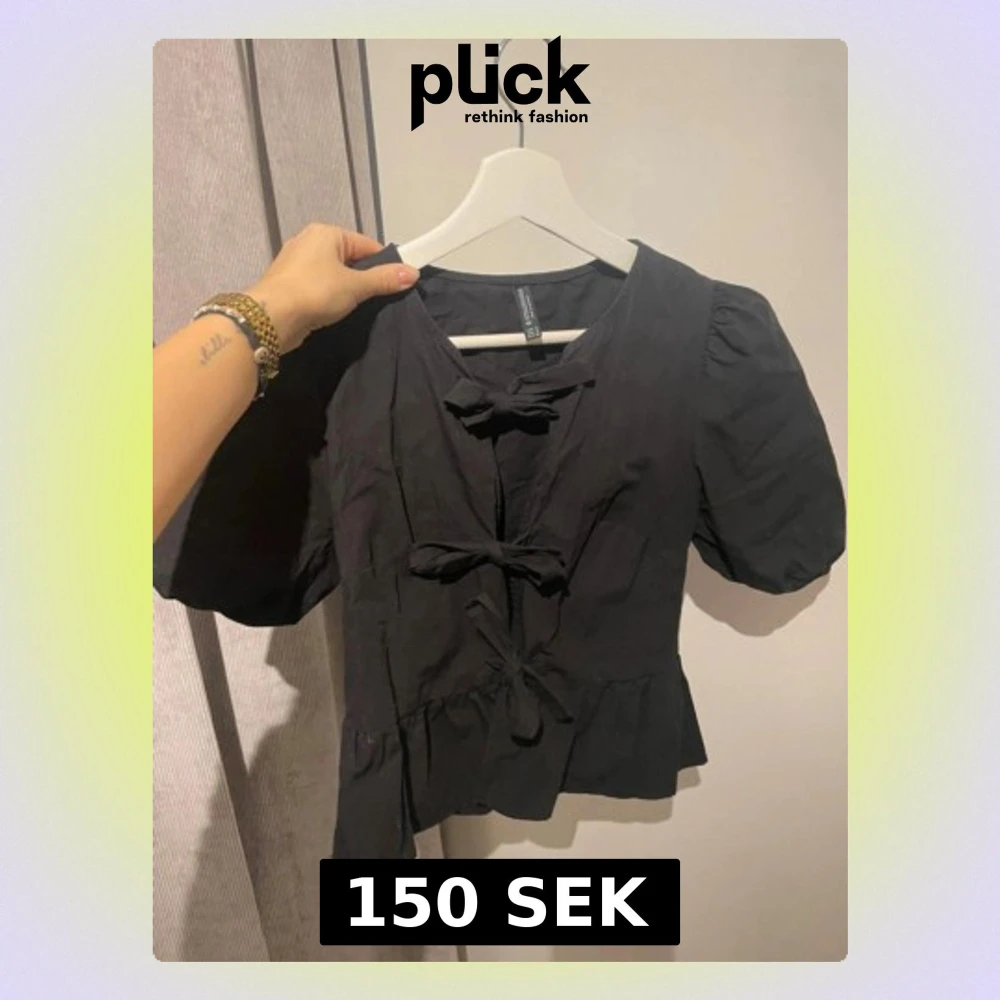 Supersöt svart blus från Stradivarius med puffiga korta ärmar och tre knytrosetter framtill. Blusen har en lätt v-ringad hals och volangkant nedtill som ger en feminin vibe❣️