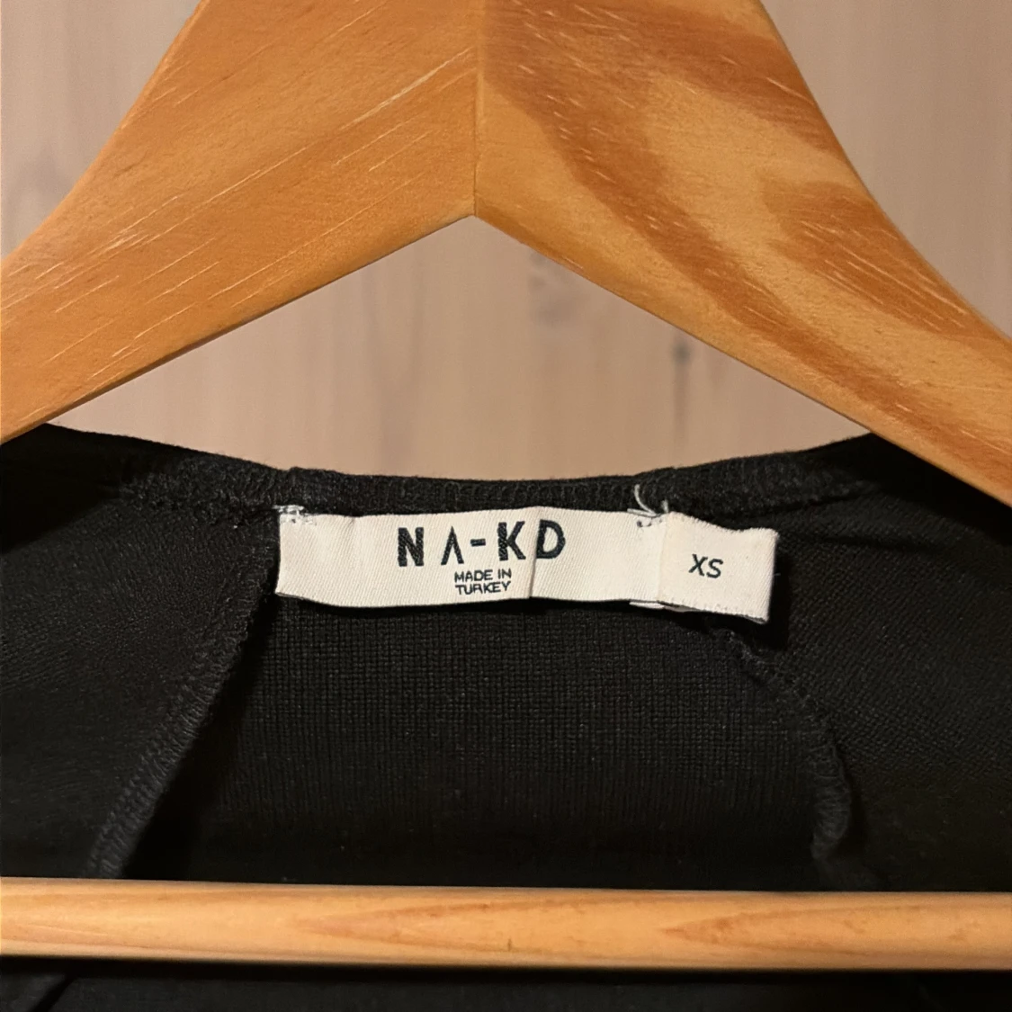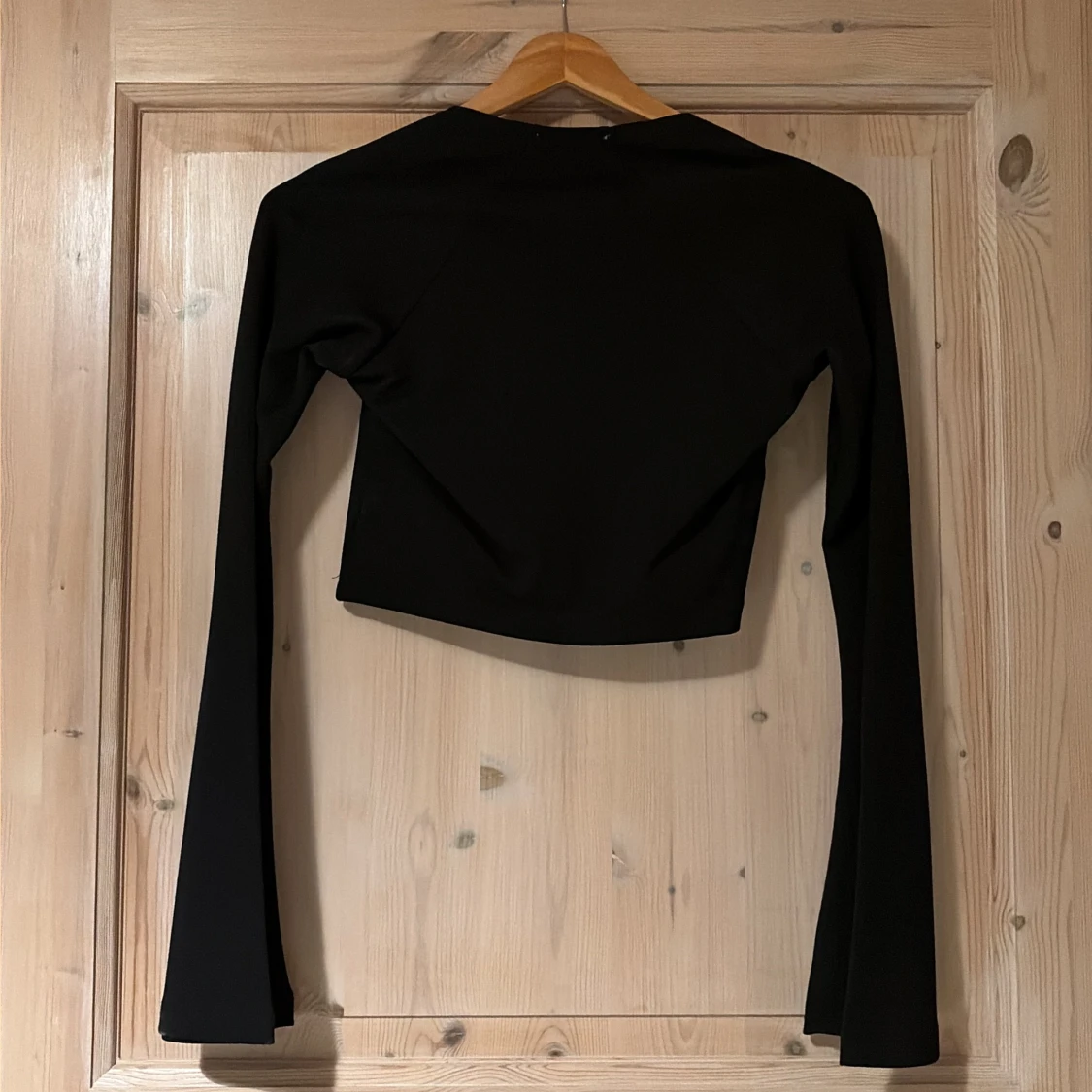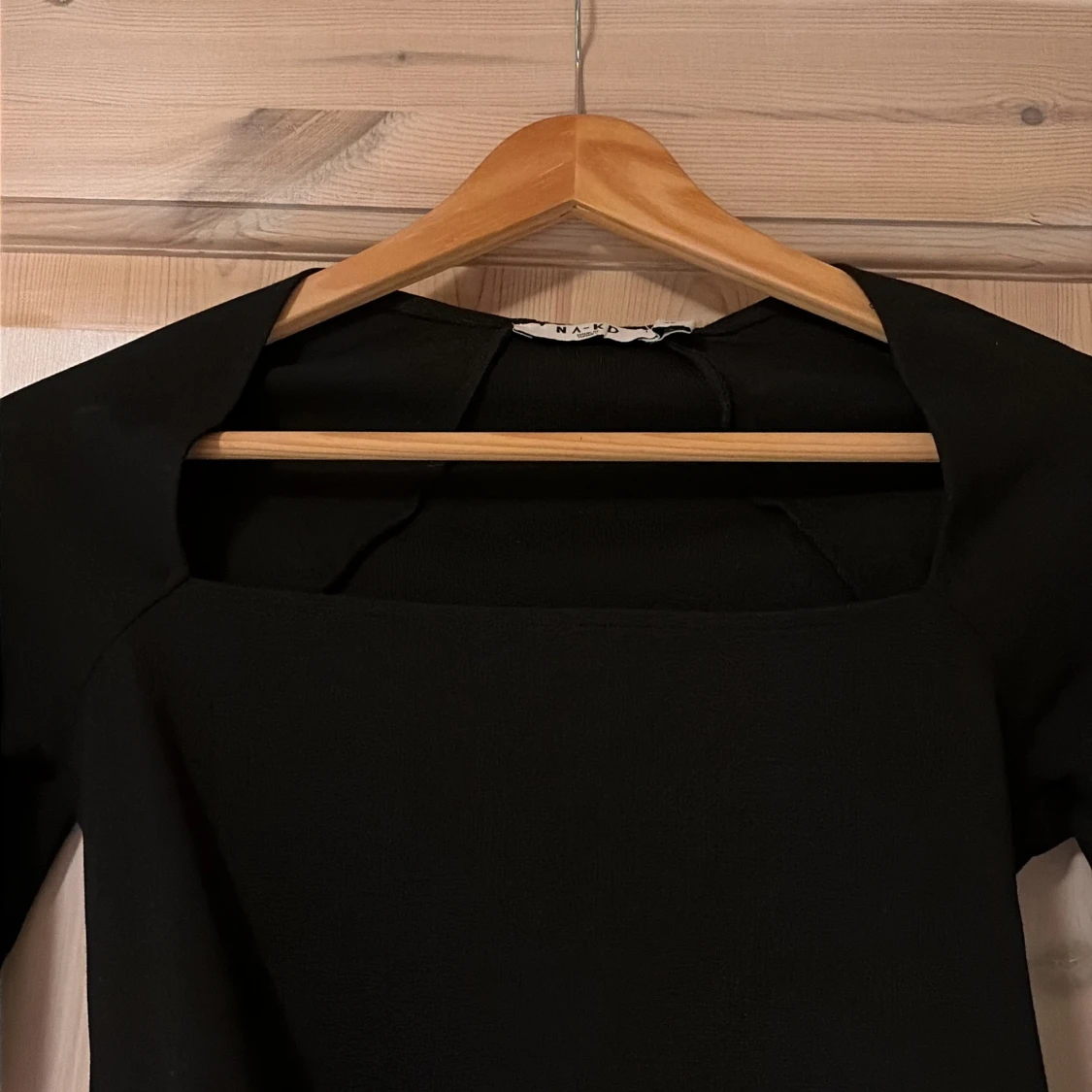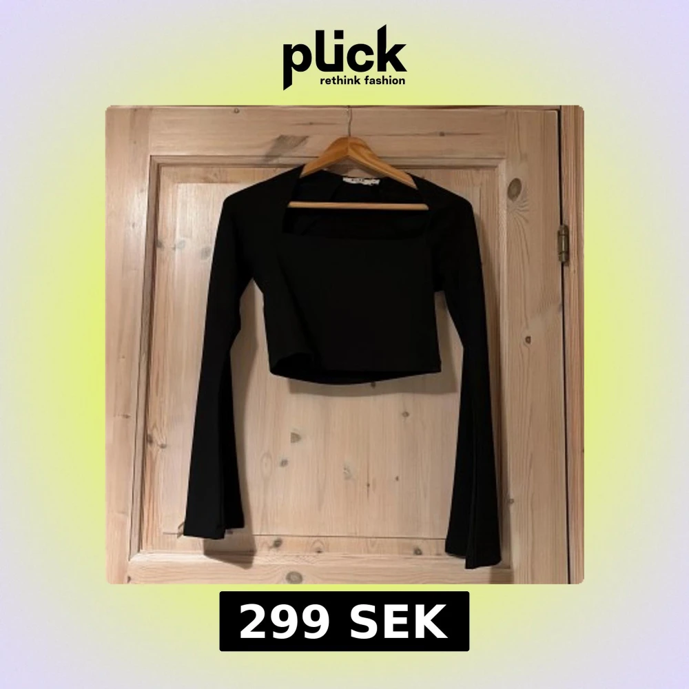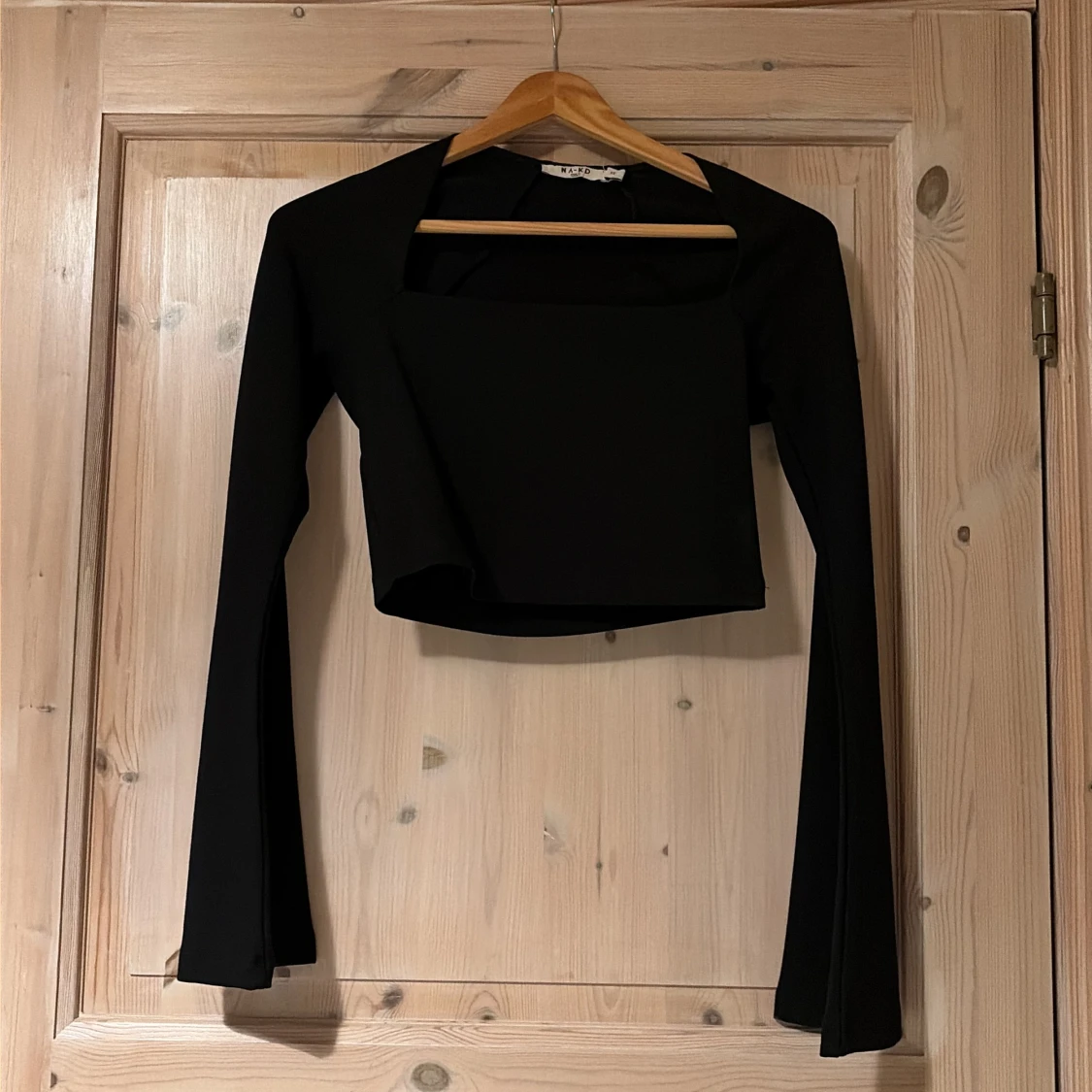 Säljer en svart croppad topp från NA-KD med lång ärm och fyrkantig halsringning. Toppen har en stilren och minimalistisk design med tight passform och är tillverkad i ett mjukt syntetmaterial.