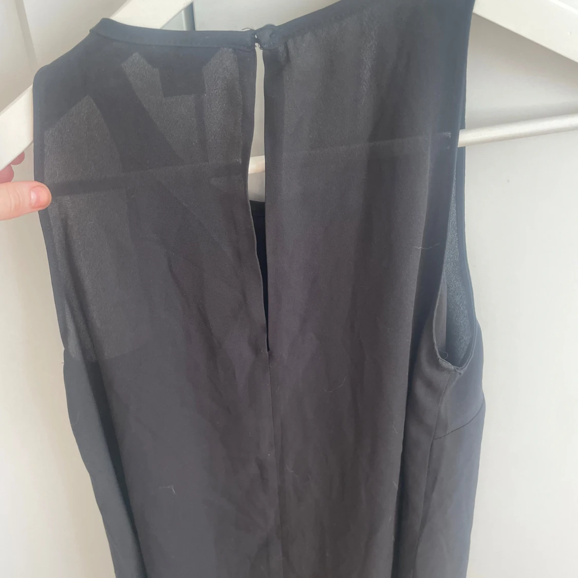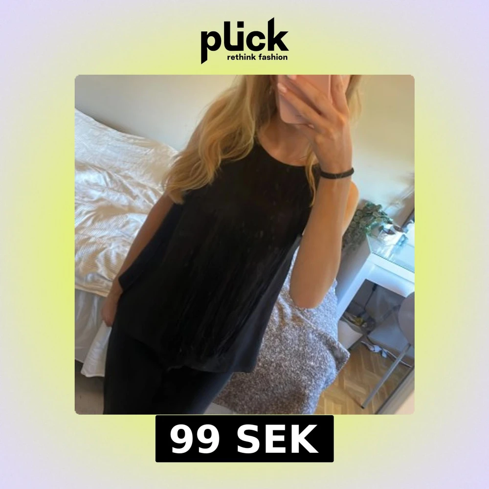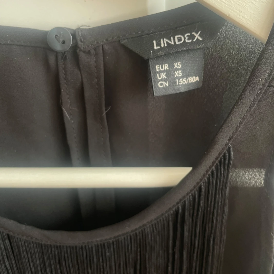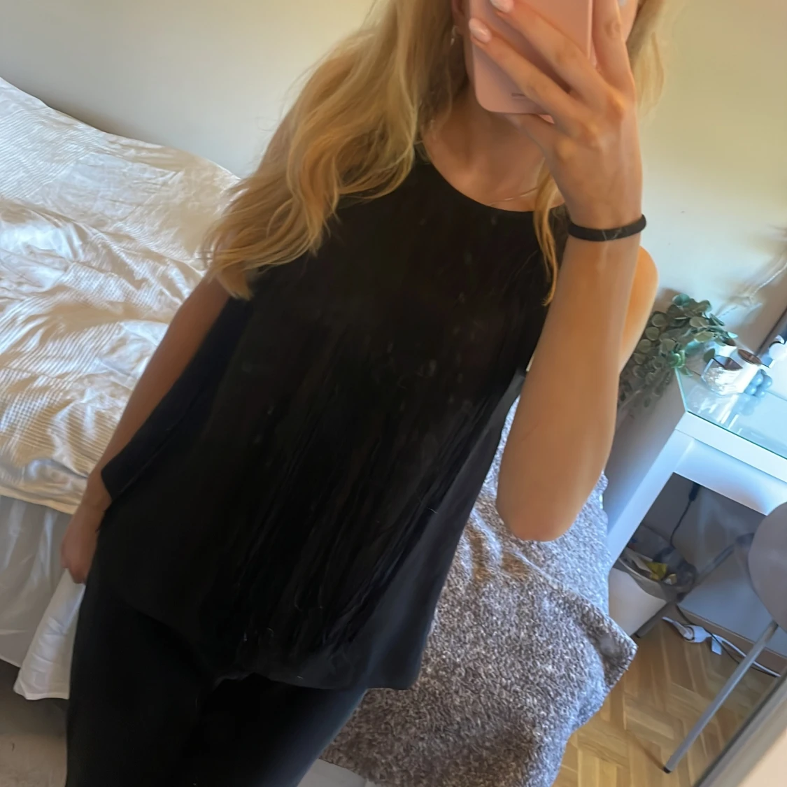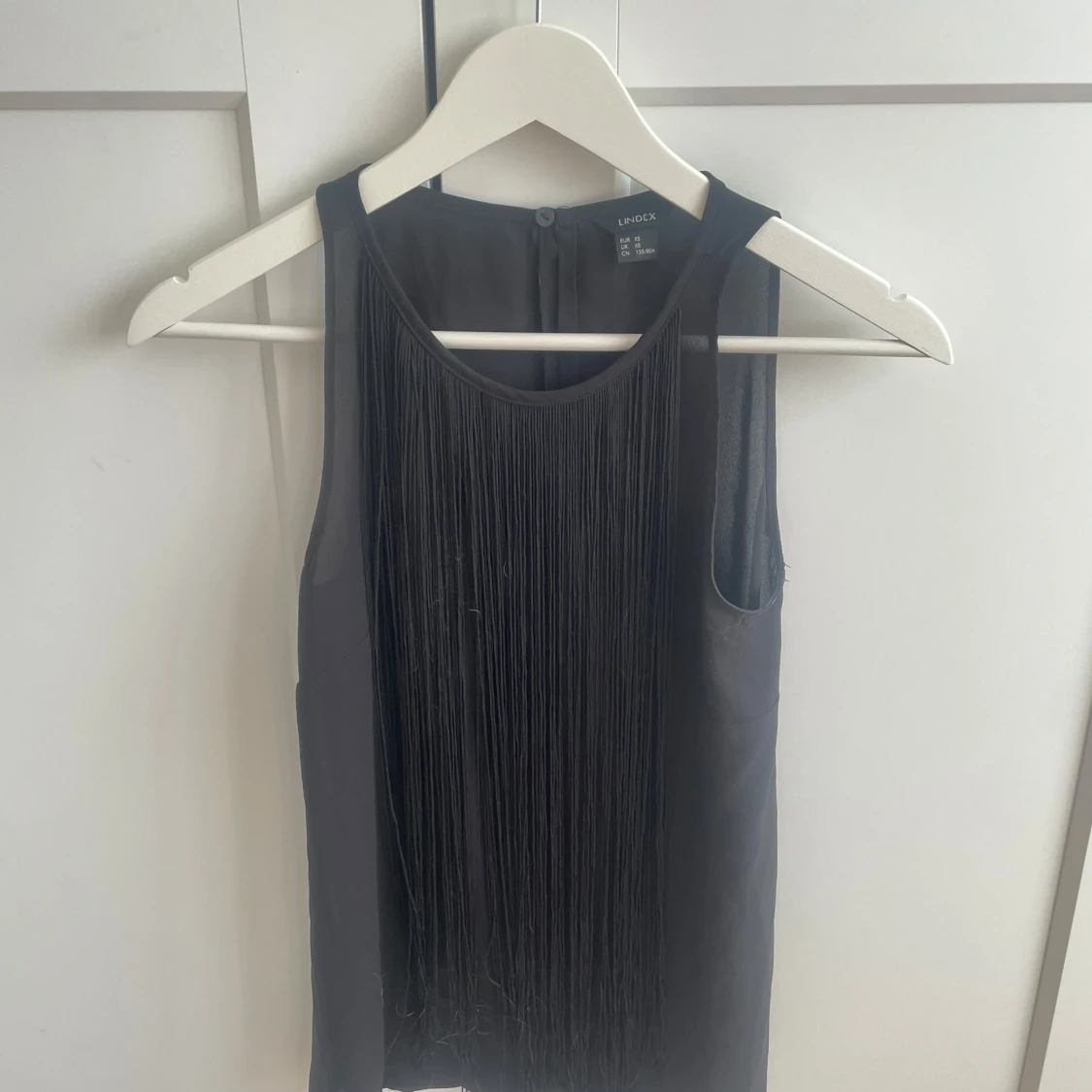 Svart ärmlös linnetopp från Lindex i storlek XS. Toppen har långa fransar framtill som ger en cool och trendig look. Baksidan är lätt transparent med knapp i nacken. Perfekt att styla med jeans eller kjol för en snygg outfit.