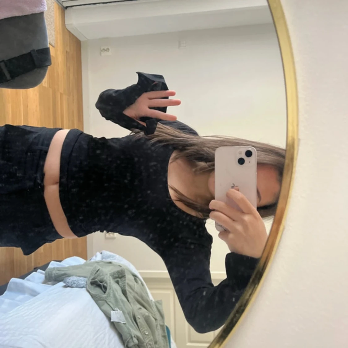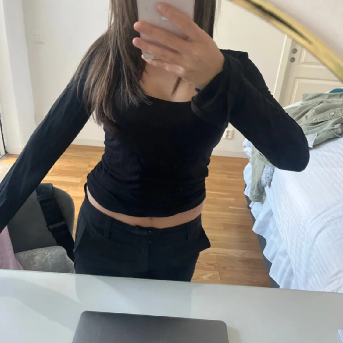 Säljer en svart långärmad croppad topp med rundad halsringning. Sitter tight och har långa ärmar med lite utsvängda muddar. Perfekt att styla med höga byxor för en clean och enkel look.