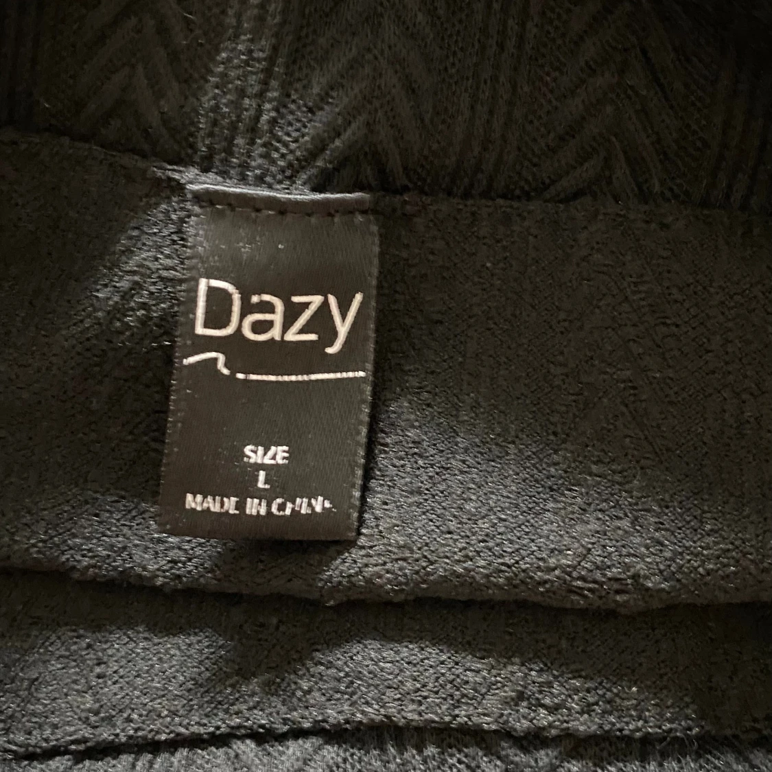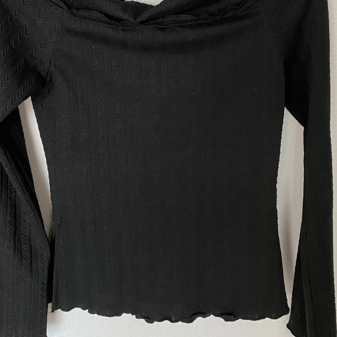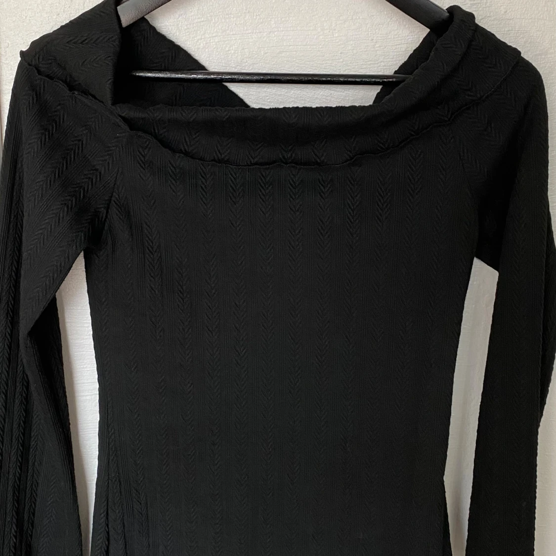 Svart långärmad topp från Dazy med subtilt fiskbensmönster i tyget. Toppen har en bred, vikt krage och lätt utsvängda ärmar. Materialet är stretchigt och känns mjukt mot huden. Perfekt för dig som gillar stilrena och trendiga plagg.