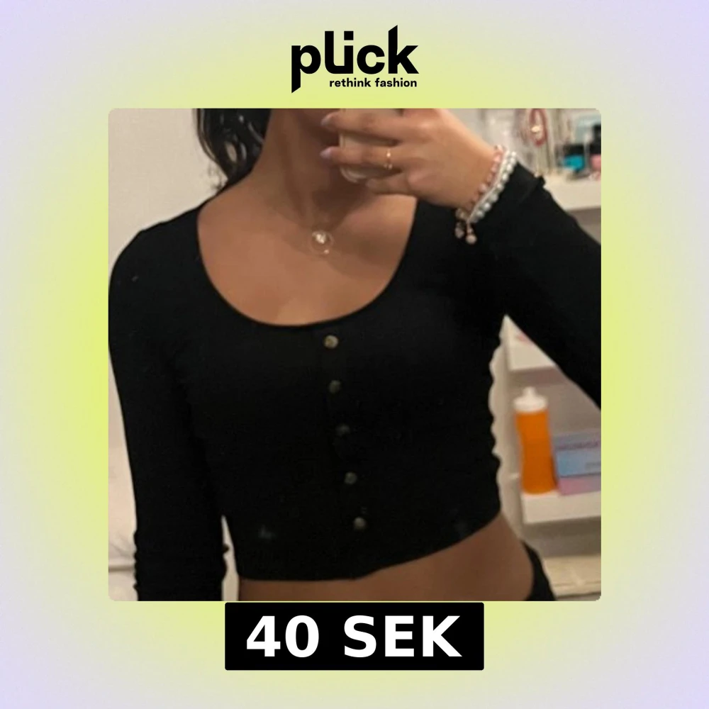 Snygg svart ribbad topp med knappar framtill. Den är croppad och har långa ärmar, perfekt för en trendig look.
