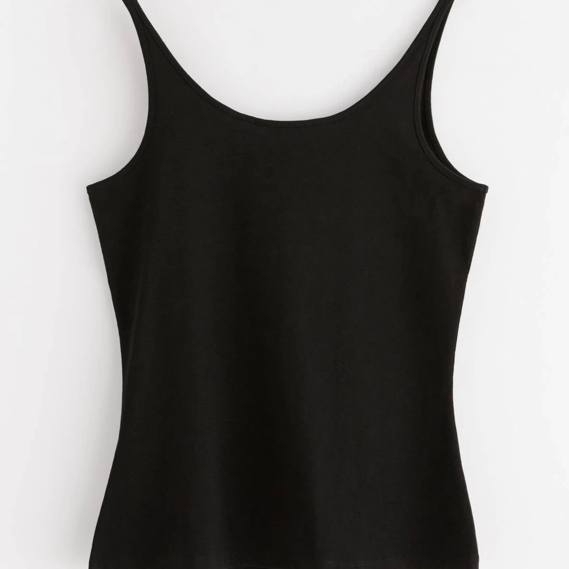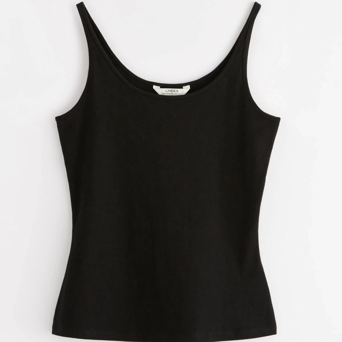 Svart, stilren linnetopp från Lindex med smala axelband och rundad halsringning. Toppen är figurnära och tillverkad i mjuk bomull som känns skön mot huden. Perfekt att matcha med jeans eller kjol för en enkel och snygg look.