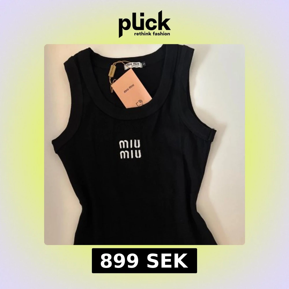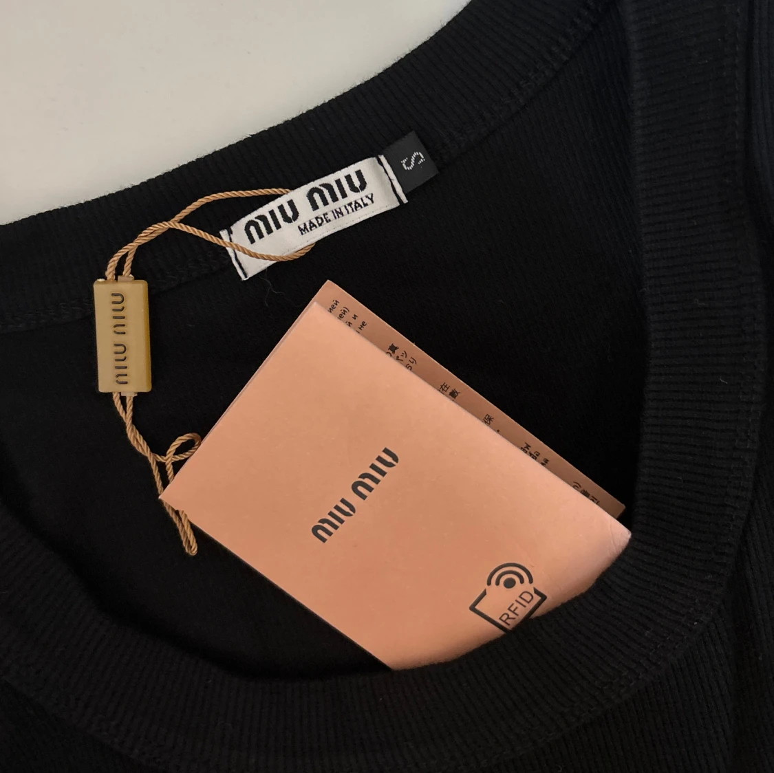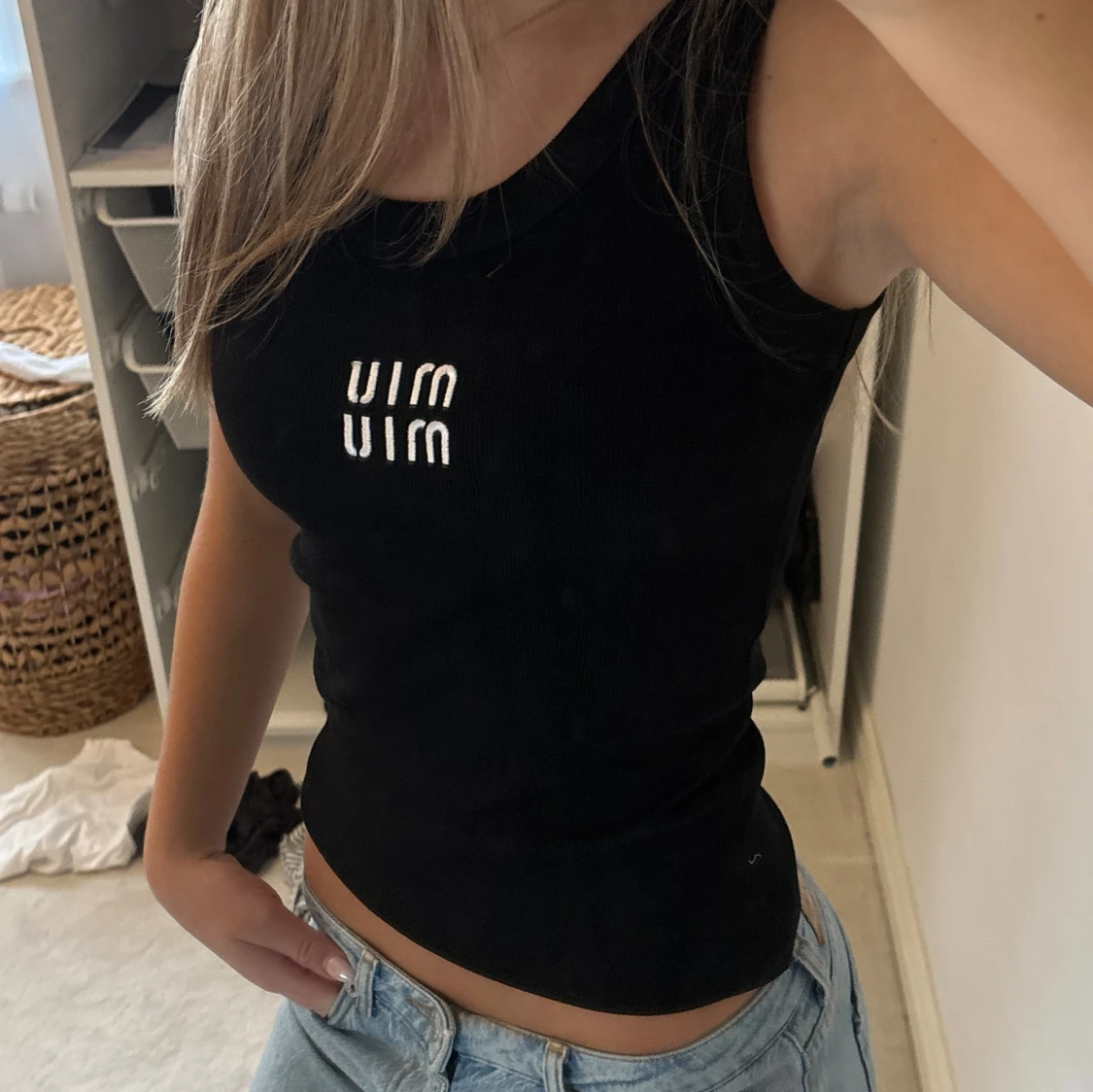 Supersnygg svart linnetopp från Miu Miu med vit broderad logga framtill. Modellen är croppad och har en tight passform med breda axelband och rund halsringning. Materialet är mjuk bomull som sitter skönt mot kroppen. Perfekt att styla med jeans eller kjol.