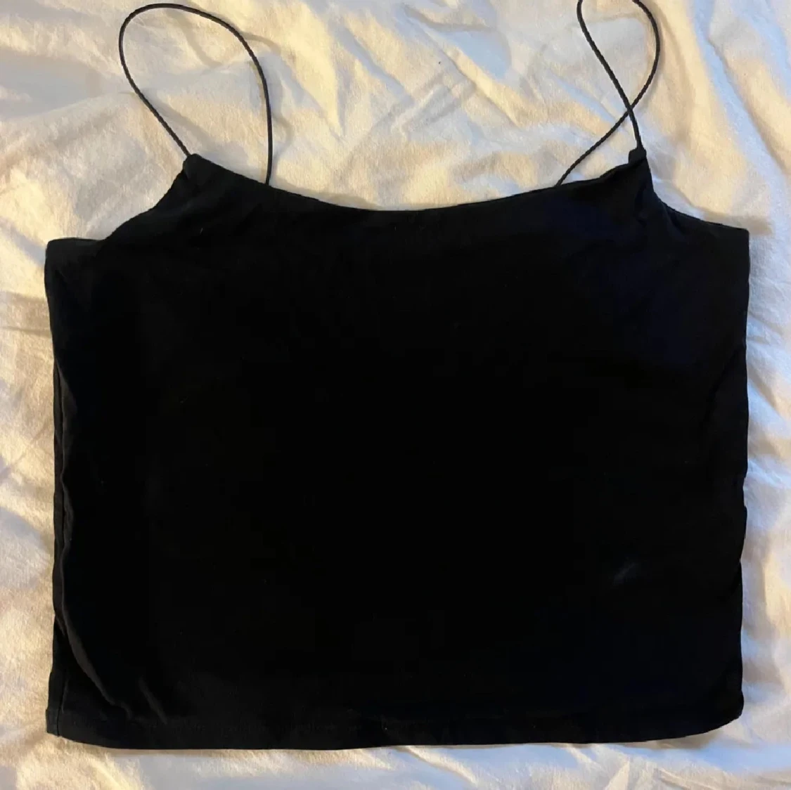 Enkel och stilren svart linnetopp med tunna axelband. Perfekt att matcha med jeans eller kjol för en clean look. Toppens raka modell gör den lätt att bära till många olika outfits.