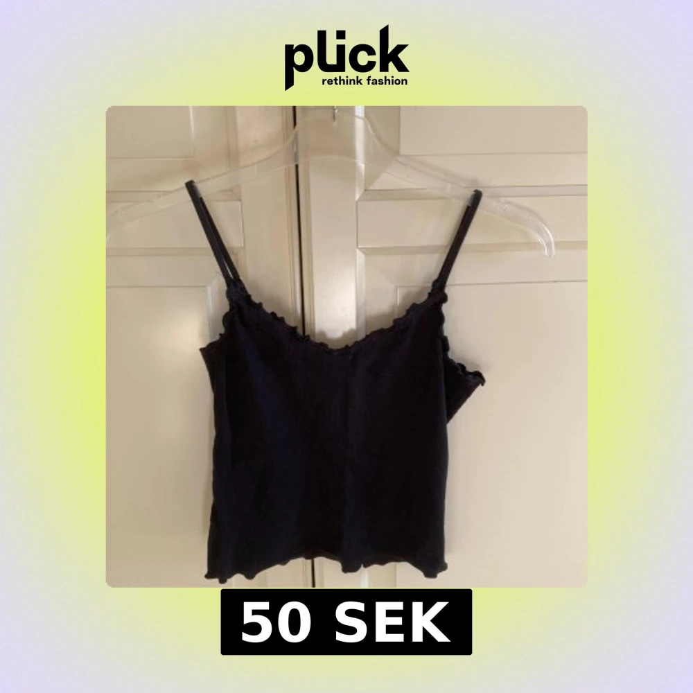 Säljer en söt svart ribbad linnetopp från Hollister. Toppen har smala axelband och en vågig kantdetalj vid halsringningen och nederkanten. I fint skick. Kort modell. Storlek L, men passar M.