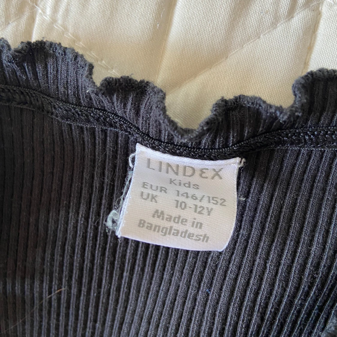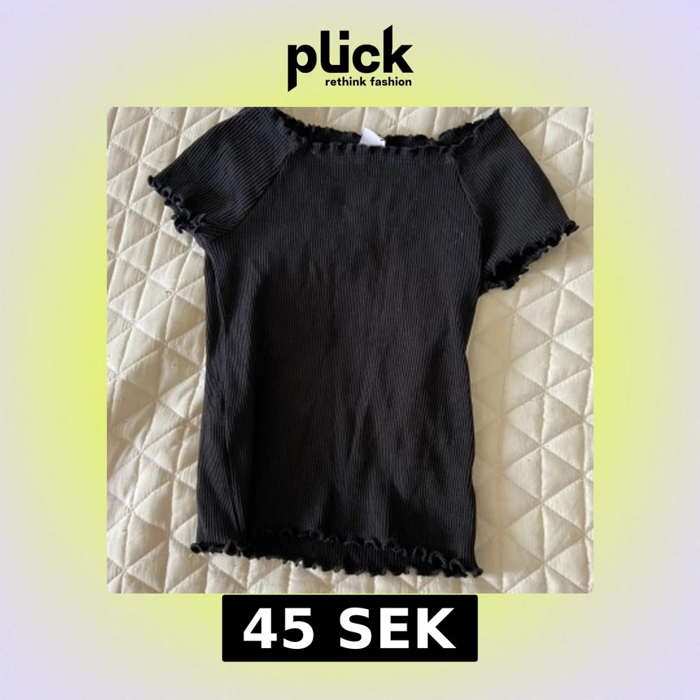 Svart topp från Lindex med korta ärmar och volangkant vid hals, ärmslut och nederkant. Toppens material är stretchigt och sitter snyggt på kroppen. Pris kan diskuteras🙃