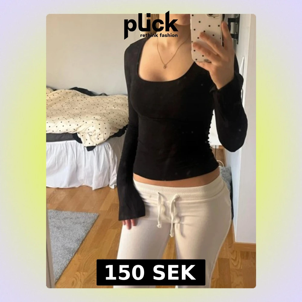 Säljer en svart långärmad topp med snygg fyrkantig ringning. Modellen är tight och croppad, perfekt för dig som gillar en enkel men stilren look. Materialet känns mjukt och stretchigt, vilket gör den skön att bära hela dagen.