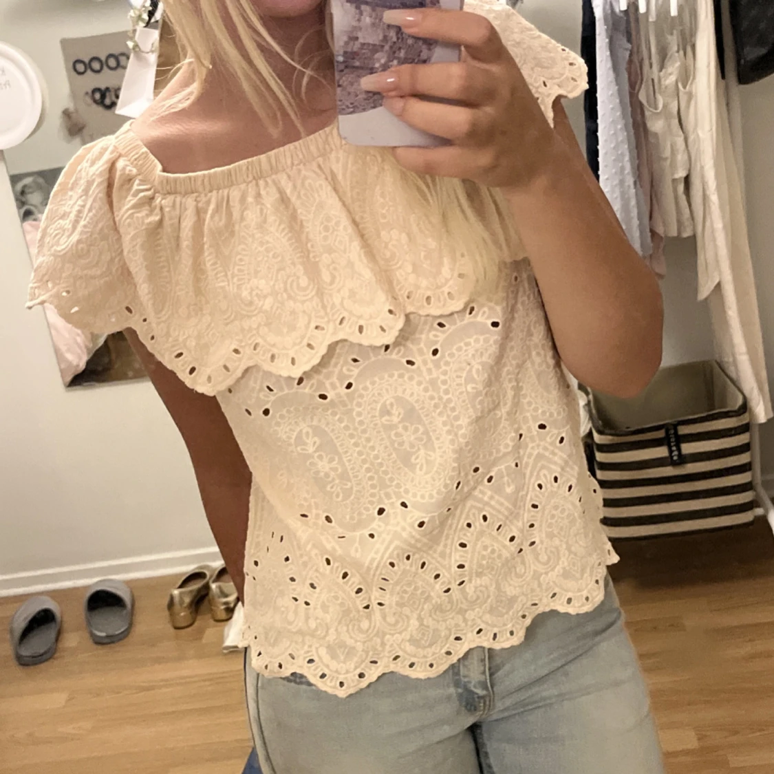 Superfin beige blus med offshoulder och bred volang runt axlarna. Toppens tyg är broderat med snygga hålmönster och har en romantisk vibe. Perfekt till ljusa jeans eller kjol för en somrig look.