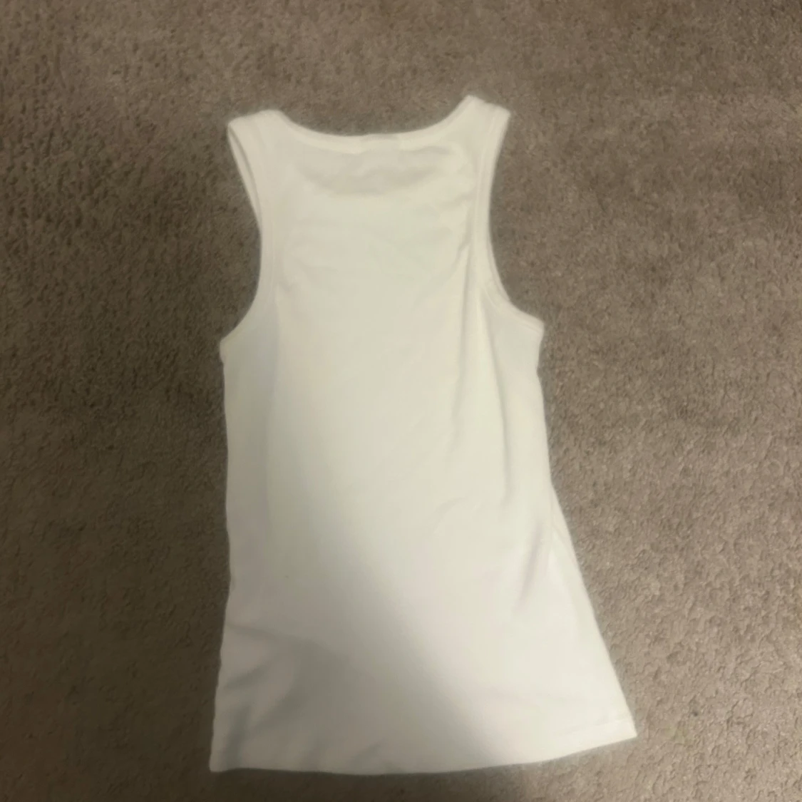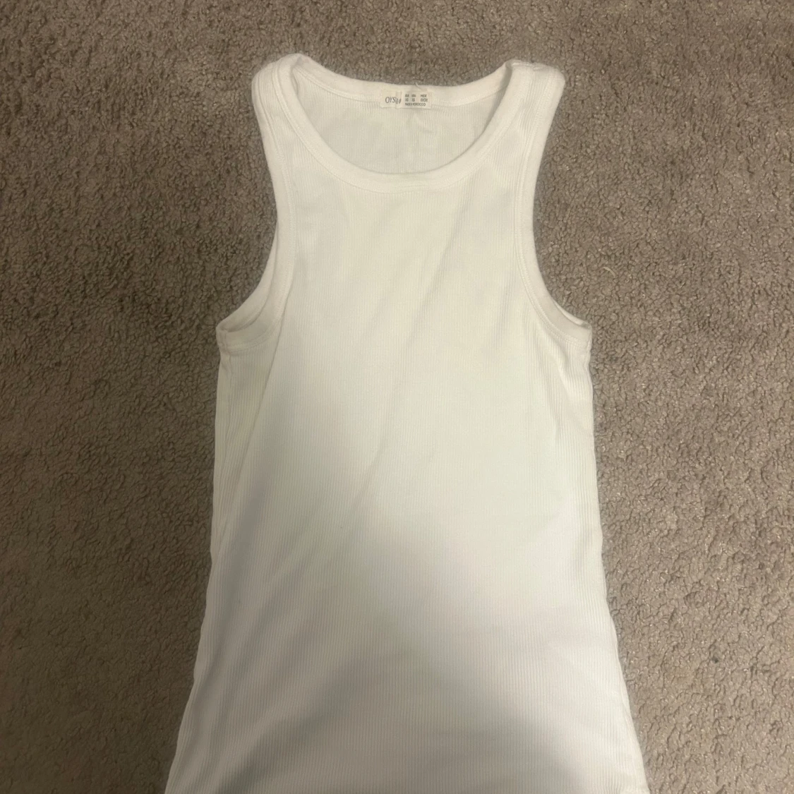 Säljer en klassisk vit ribbad linnetopp från OYSHO i storlek XS. Toppen är ärmlös med rund halsringning och har en tight passform. Perfekt att styla med jeans eller shorts för en enkel och fräsch look.