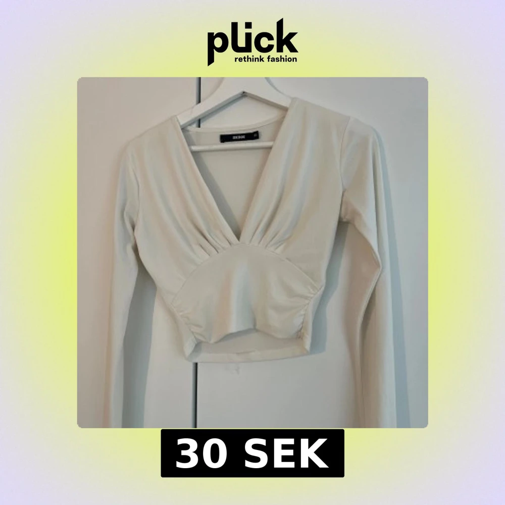 Vit topp från Bikbok i stl Xs, är en liten mörk fläck på baksidan vid armbågen på tröjan annars fint skick!
