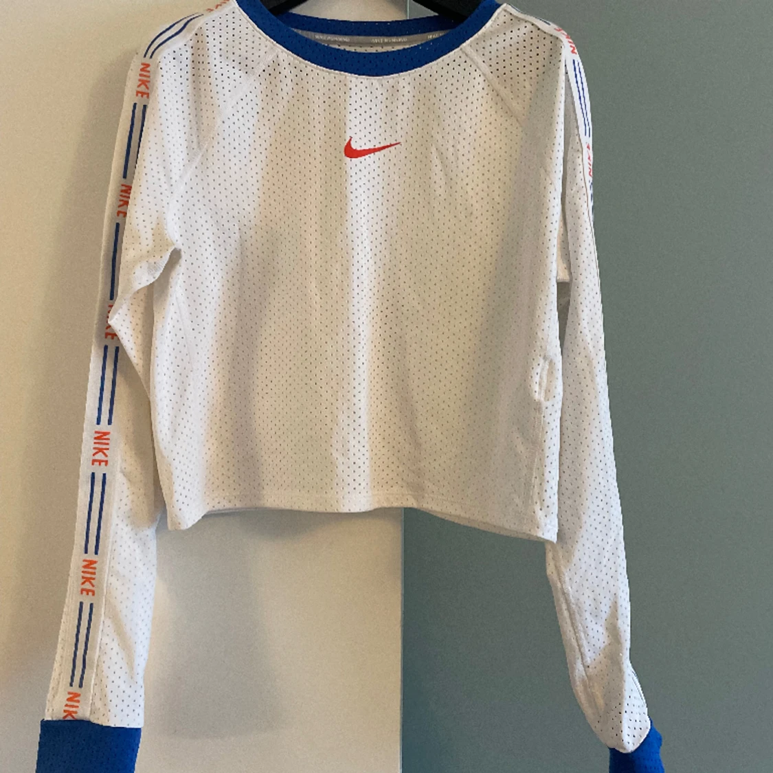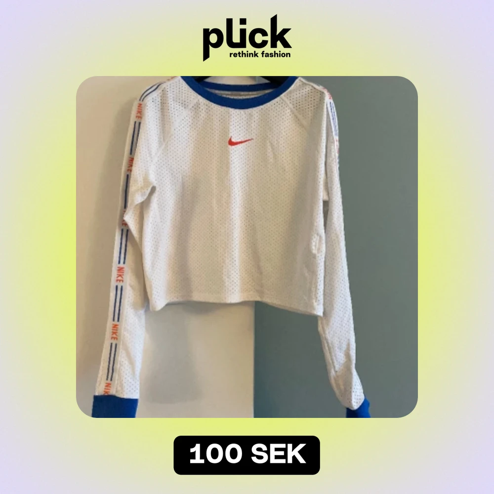 Nike tröja i funktionsmaterial i storlek S. Lång ärmar, något kortare i midjan. Sparsamt använd(ca 3-6ggr). Kan användas både som träningströja eller vardagstop.