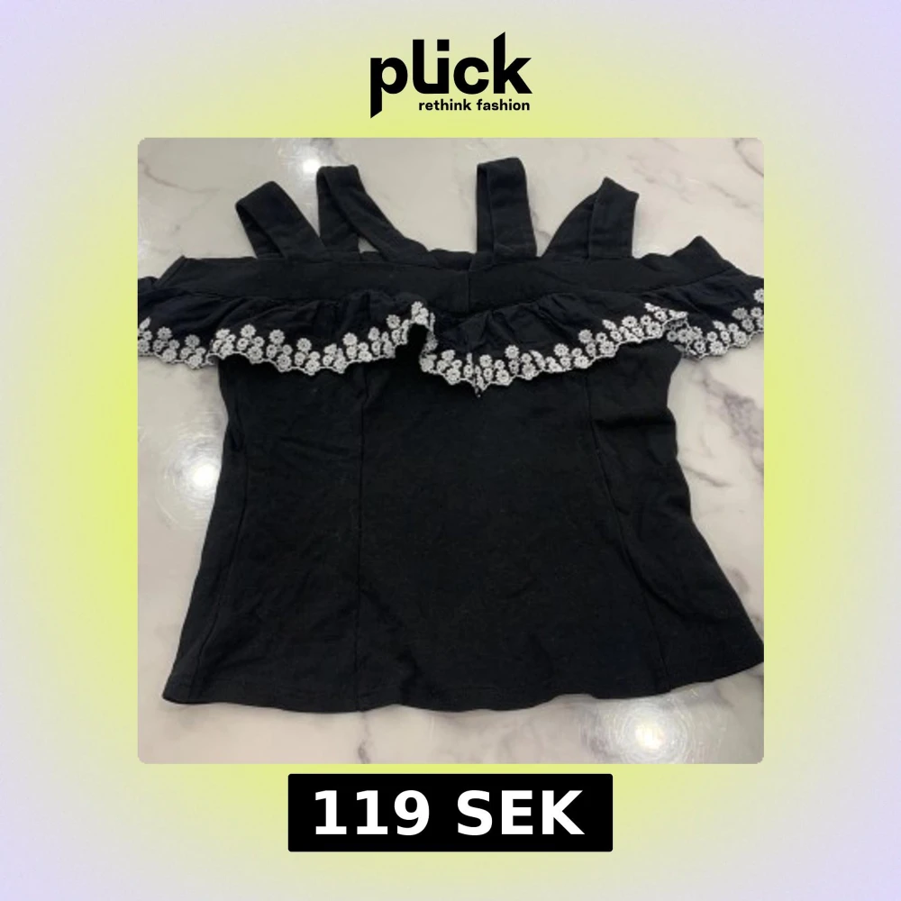 Snygg svart topp från Lost Ink med volangdetalj och blommig spets längs kanten. Perfekt för en stilren look med en touch av romantik. Axelbandslös design som ger en elegant känsla.