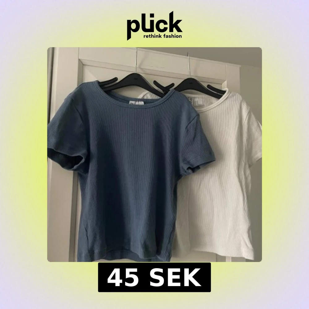 Två ribbade toppar i blått och vitt med korta ärmar i storlek XS. Perfekta för en avslappnad stil. De har en rund halsringning och är tillverkade i ett mjukt material. Använda endast ett fåtal gånger! Skriv för fler bilder💗