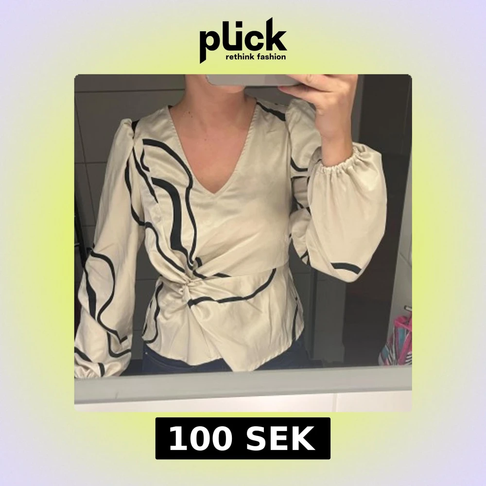 Snygg beige omlottblus med svart abstrakt mönster. Blusen har långa ärmar med resår vid ärmsluten och en v-ringad hals. Perfekt för en stilren look.