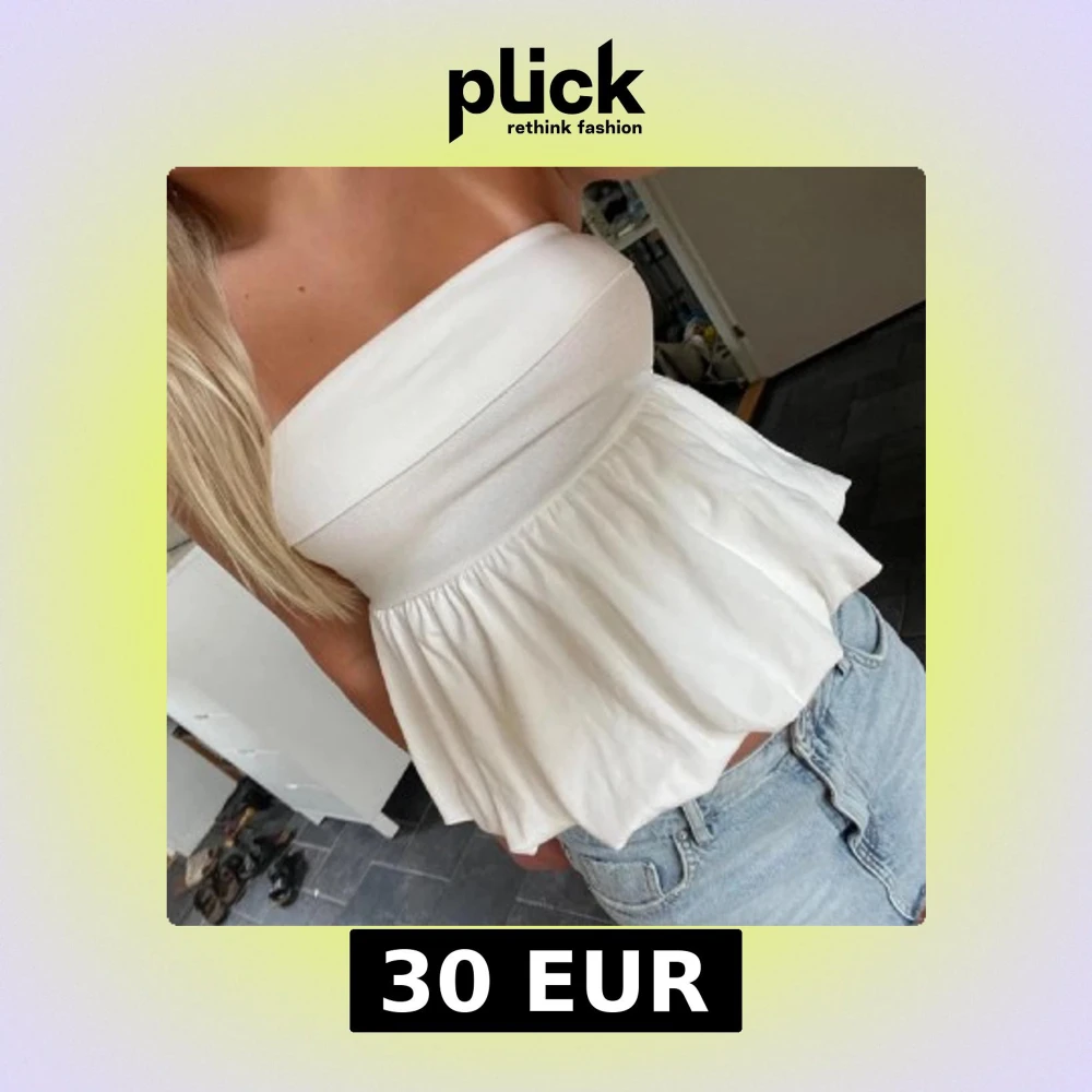 Säljer en söt vit axelbandslös topp med volangdetaljer. Perfekt för sommardagar och kan enkelt matchas med jeans eller kjol. Toppen har en bekväm passform och är tillverkad i ett mjukt material. Bilder av förra ägaren