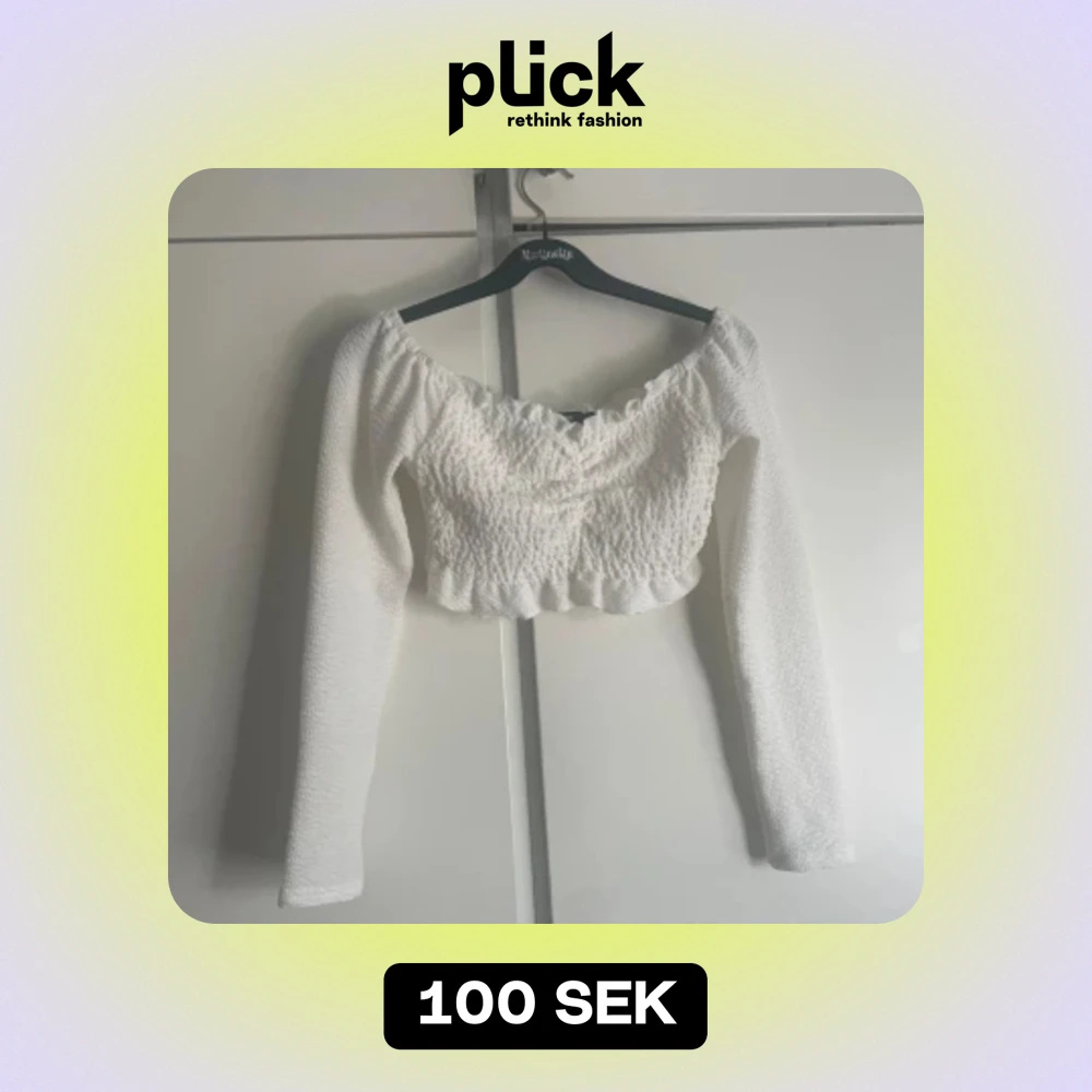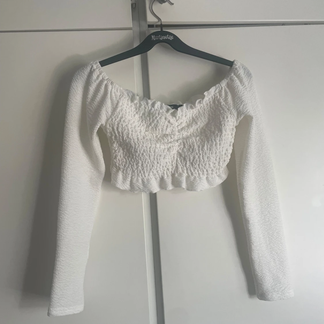 Säljer en superfin vit långärmad topp. Den är offshoulder och har en smockad design som gör den både bekväm och snygg. Perfekt för både vardag och fest! Toppen är croppad och har en söt volangkant längst ner. Passar perfekt till ett par höga jeans eller kjol. 🥰