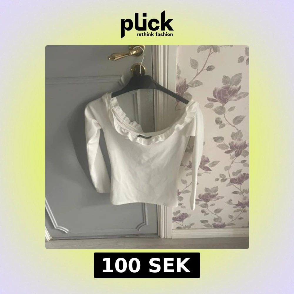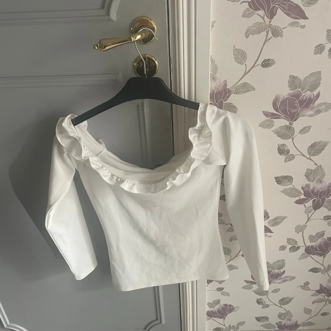 Säljer en vit långärmad topp med bred volang runt den vida, runda urringningen. Toppen har en feminin och stilren look, perfekt att styla med jeans eller kjol. Materialet känns mjukt och stretchigt.