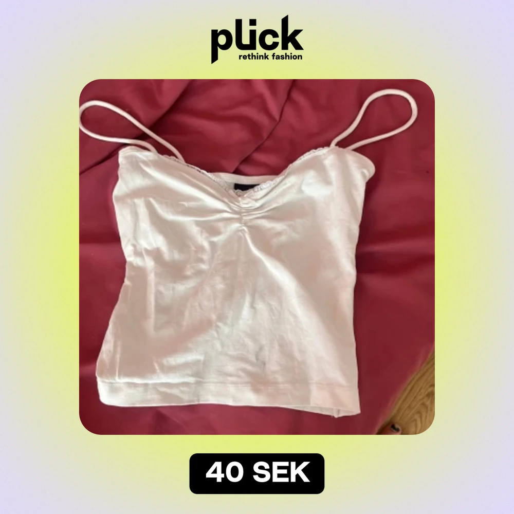 En vit linnetopp med smala axelband och spetsdetaljer vid halsringningen. Toppen har en åtsittande passform och är tillverkad i ett mjukt material.