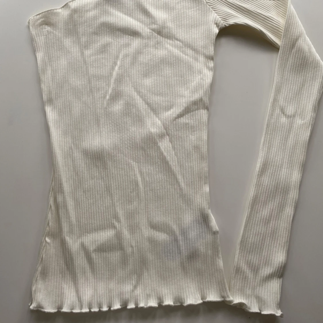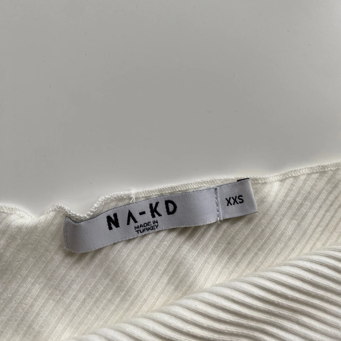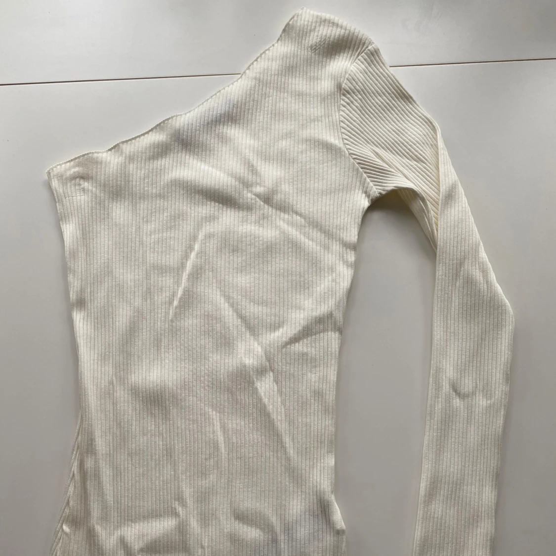 Säljer en vit ribbad oneshoulder topp från NA-KD i storlek XXS. Toppen har lång ärm på ena sidan och ärmlös på andra, vilket ger en cool asymmetrisk look. Materialet är mjukt och stretchigt, perfekt för att skapa en trendig outfit.