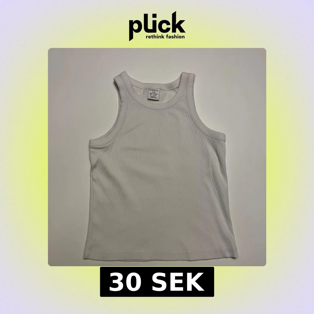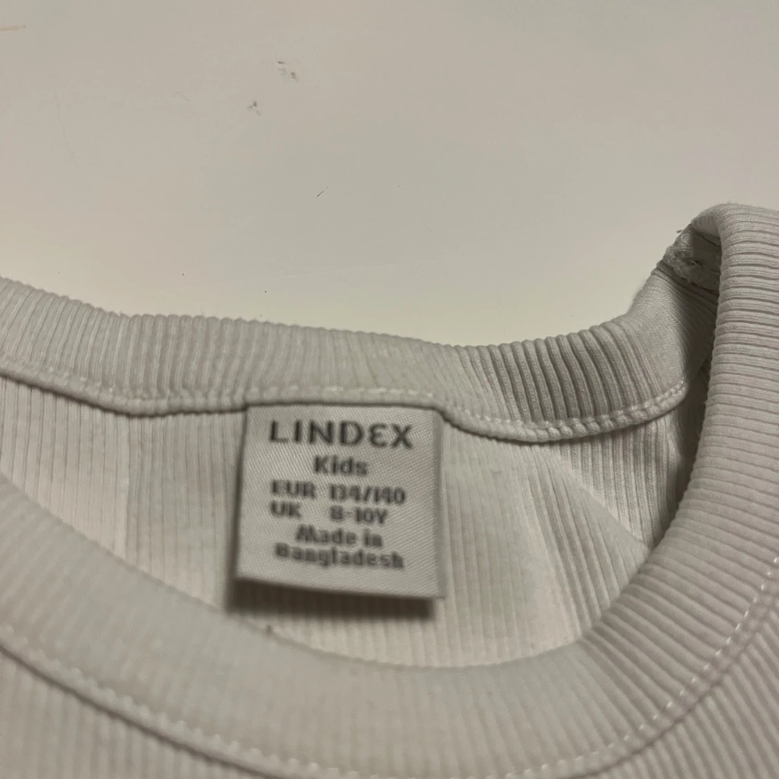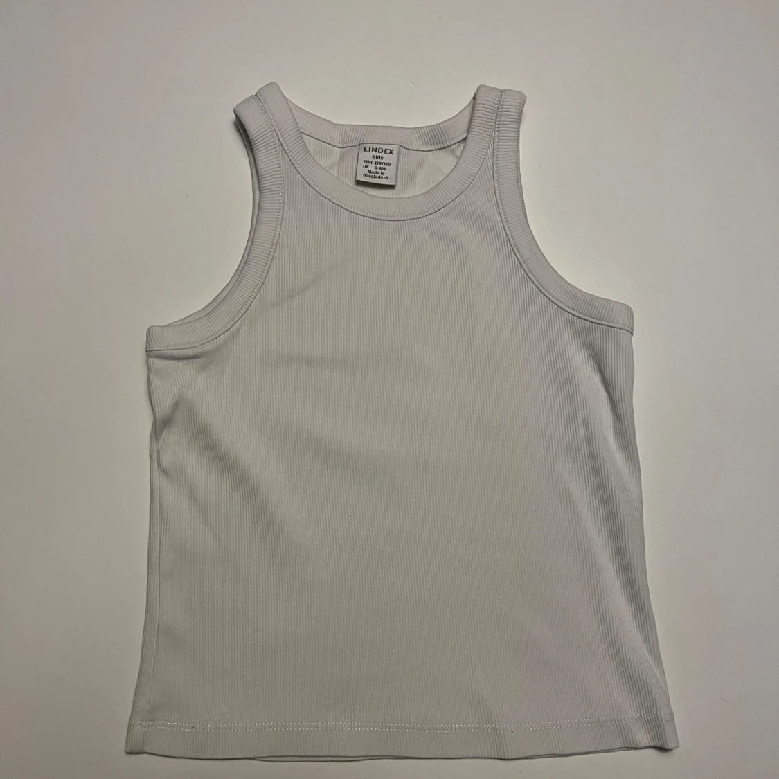 Säljer en vit ribbad linnetopp från Lindex för barn. Perfekt för varma sommardagar eller som ett basplagg i garderoben. Enkel och stilren design.