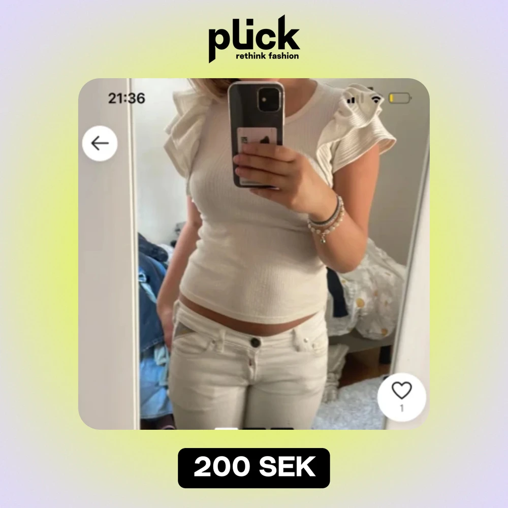 Säljer en superfin vit ribbad topp med volangdetaljer på ärmarna. den har en stilren look som passar perfekt till både vardag och fest. Toppen är i nyskick och gjord av ett mjukt material som känns skönt mot huden. köpt för 300 säljer för 200 nyskick endast testad
