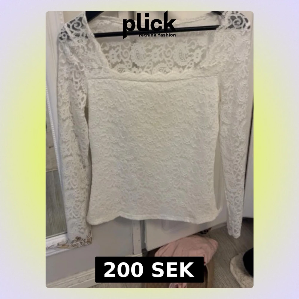 Säljer en vit blus i spets med långärmade ärmar och fyrkantig ringning. Blusen är figurnära och har ett vackert spetsmönster över hela plagget, inklusive ärmarna. Perfekt för dig som gillar romantisk och feminin stil.