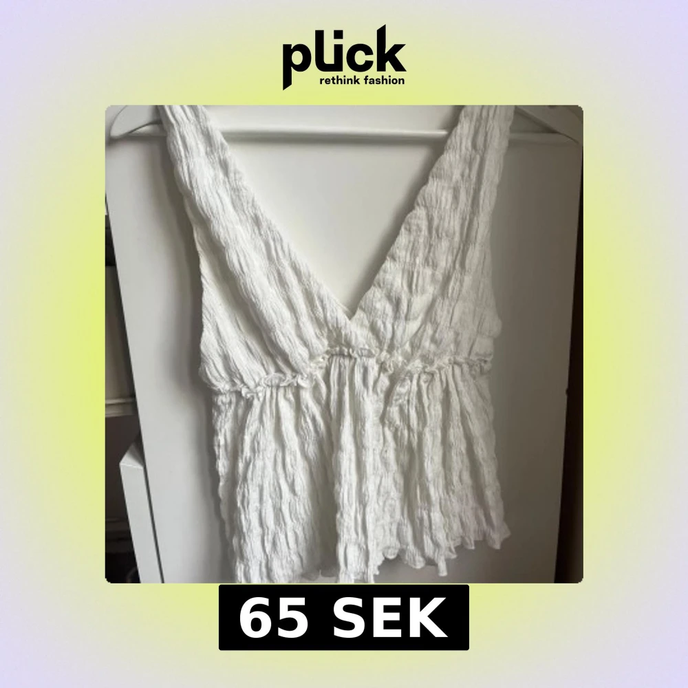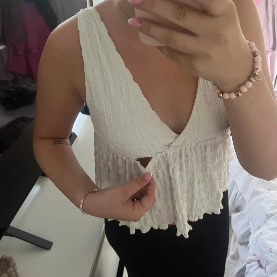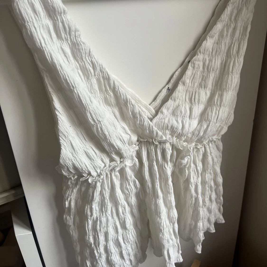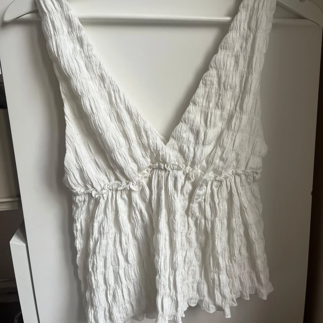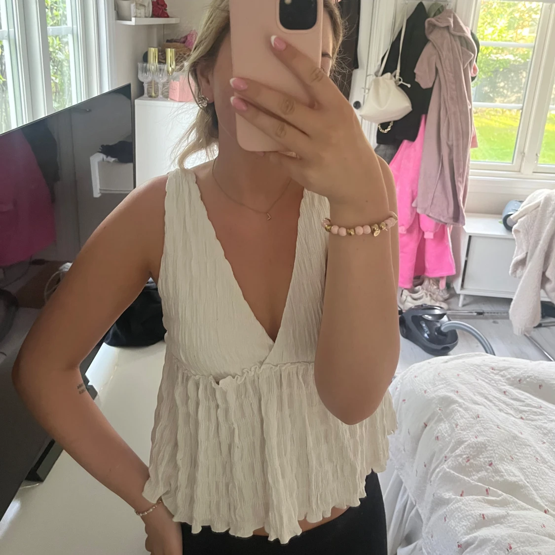 Supersöt vit omlott linnetopp med djup v-ringning och breda axelband. Toppen har en luftig, vågig struktur och knytning i midjan som ger en avslappnad och somrig känsla. Perfekt till varma dagar och lätt att matcha med jeans eller kjol.