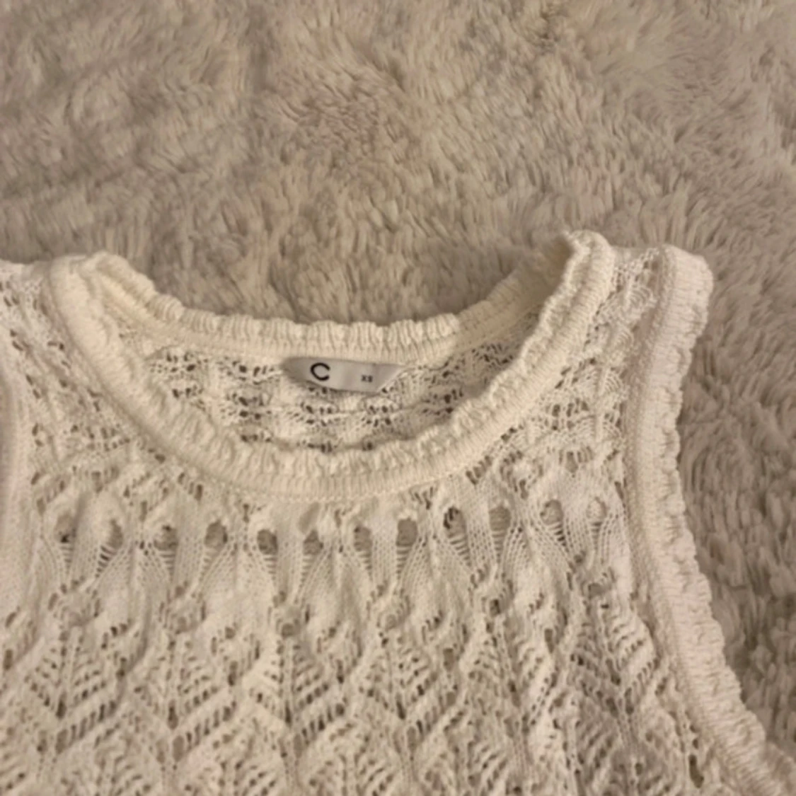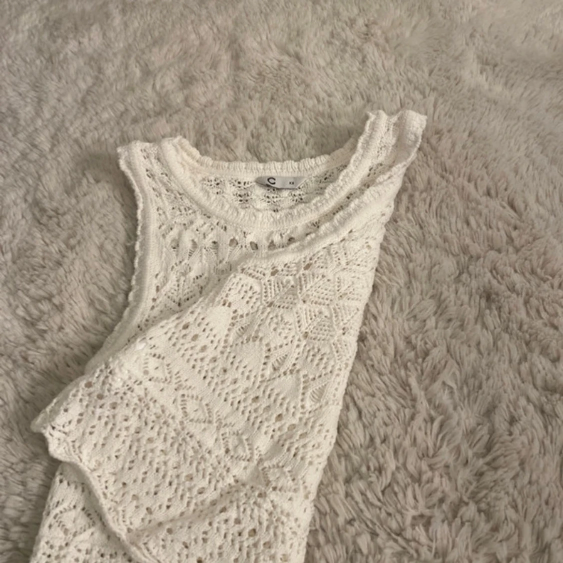 Superfin vit linnetopp från Cubus i storlek XS. Toppen är virkad med ett detaljerat mönster och har rund halsringning. Ärmlös och perfekt för varma dagar, med en boho-vibe och snygga virkade kanter. Passar dig som gillar ljusa och luftiga plagg.
