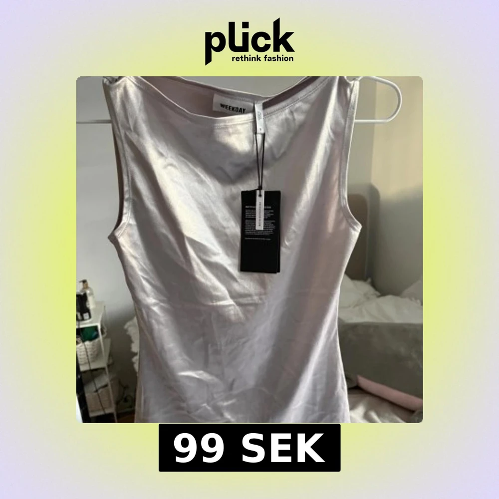 Säljer en snygg och glansig silverfärgad linnetopp från Weekday. Toppen är ärmlös och har en slät, stilren design i ett mjukt och följsamt material. Perfekt att styla med jeans eller kjol för en trendig look.