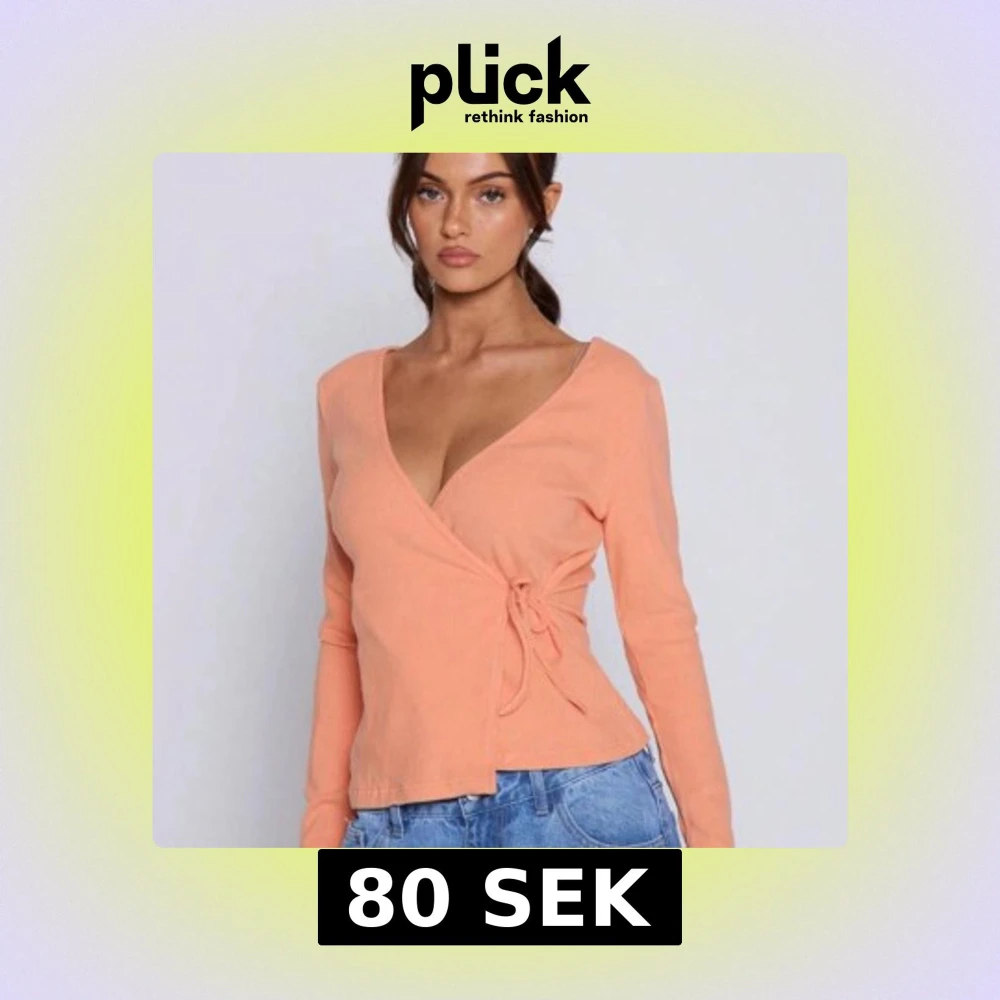 Säljer en persikofärgad omlottopp med lång ärm och v-ringning. Toppen har knyt i sidan och är tillverkad i ett mjukt, ribbat material. Perfekt att styla med jeans för en chill look.så snygg men använder inte den !