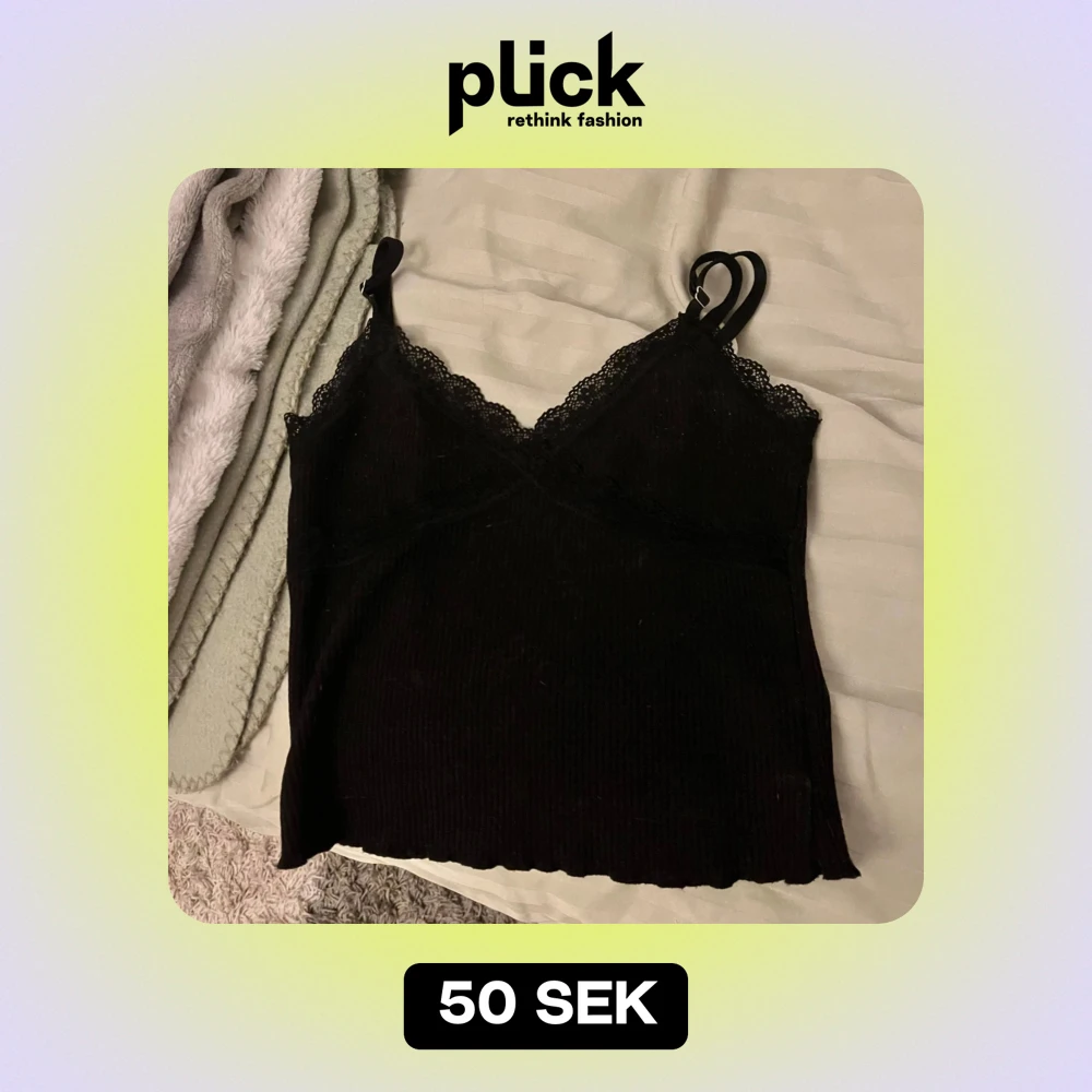 Säljer en snygg svart ribbad linne med spetsdetaljer vid halsringningen. Perfekt för både vardag och fest! Den har justerbara axelband för bästa passform. Använd ett fåtal gånger, så den är i mycket bra skick.