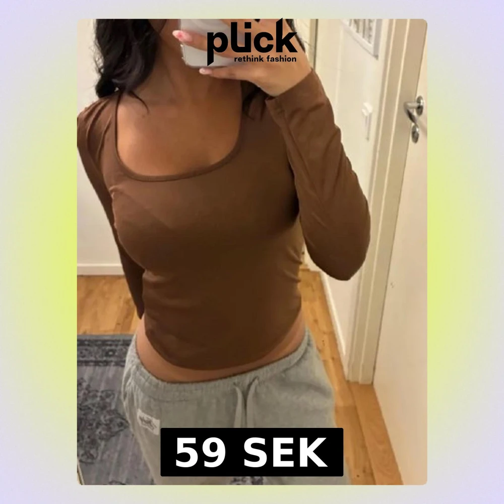 Säljer en brun långärmad topp med snygg fyrkantig halsringning. Modellen är tight och sitter figurnära, perfekt för dig som gillar en enkel men stilren look. Materialet känns mjukt och stretchigt, vilket gör den skön att bära hela dagen.