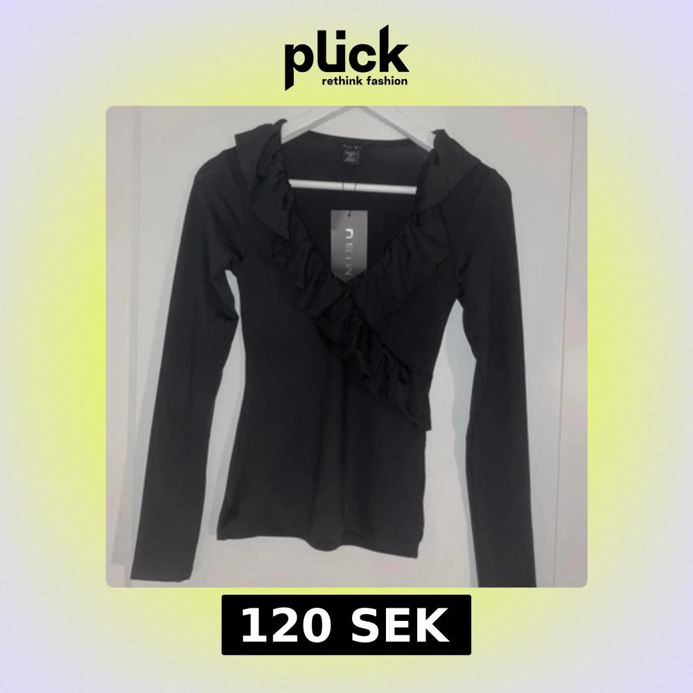 Säljer en svart långärmad topp från Amisu med snygg volangdetalj längs ringningen. Toppen har en figurnära passform och är perfekt för att lyfta en enkel outfit.