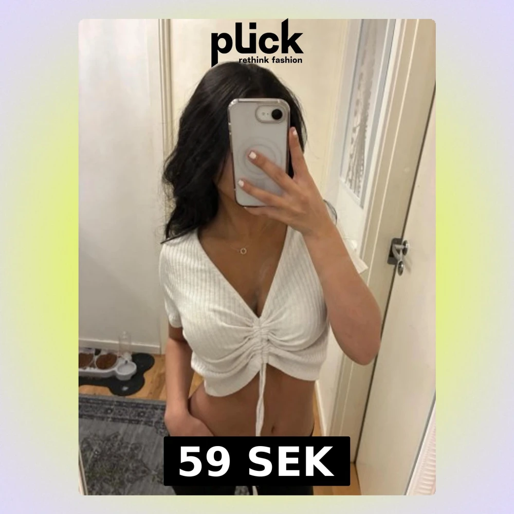 Säljer en vit croppad topp med korta ärmar och v-ringning. Toppen har ribbad struktur och snygg snörning framtill som ger en omlott-effekt. Man kan justera storleken själv. Storlek M men sitter som S/XS.