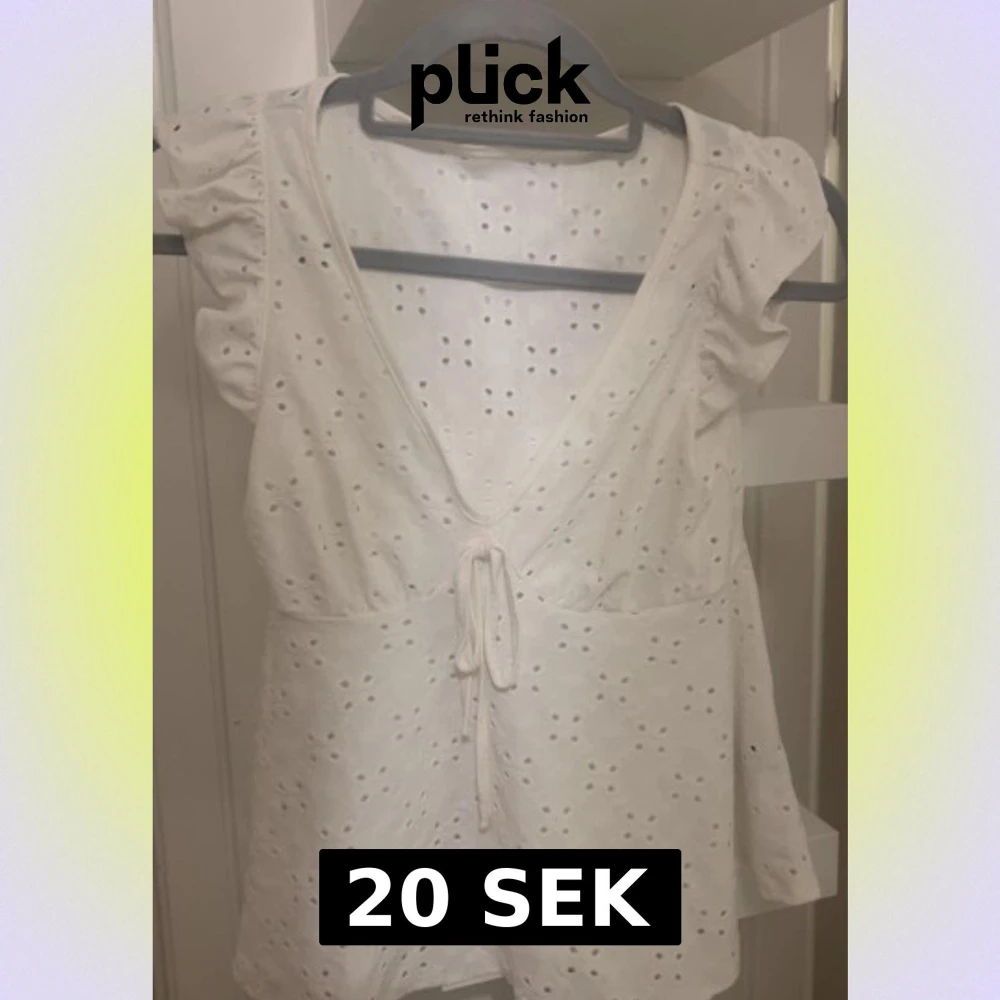 Supersöt vit blus från SHEIN i storlek XS. Blusen har broderade hålmönster, volangärmar och djup v-ringning med knyt framtill. Skriv gärna för fler bilder eller frågor💗